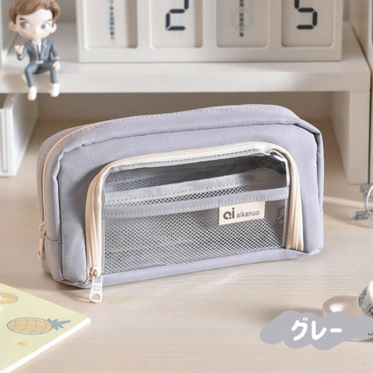 クリアポケット付き 自立型クリアペンケ日用品雑貨 文房具 手芸 人気vertical-key: ベージュ ミントブルー グレー ブルー グリーン ブラック