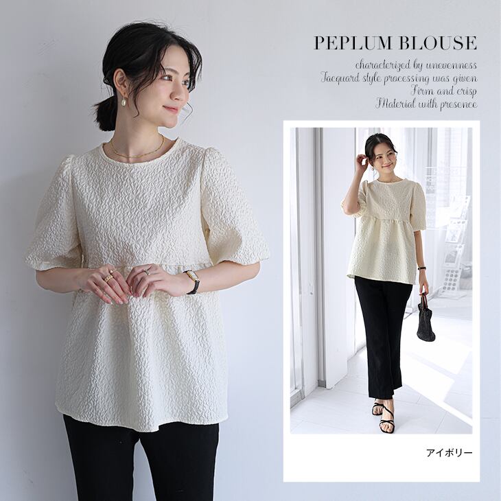 選べる2タイプ ペプラムブラウス ラウンドネック スクエアネック レディーストップス 半袖 五分袖 パフスリーブ 切り替え 柔らかい フェミニン 膨れ素材 シワ加工 ポコポコ