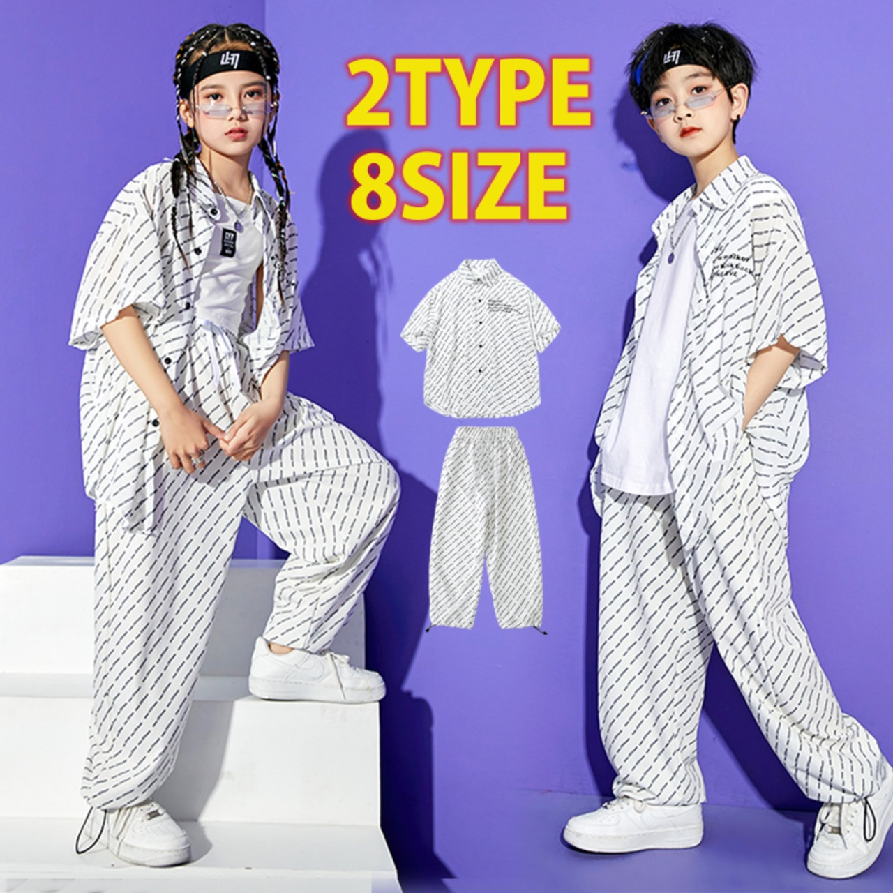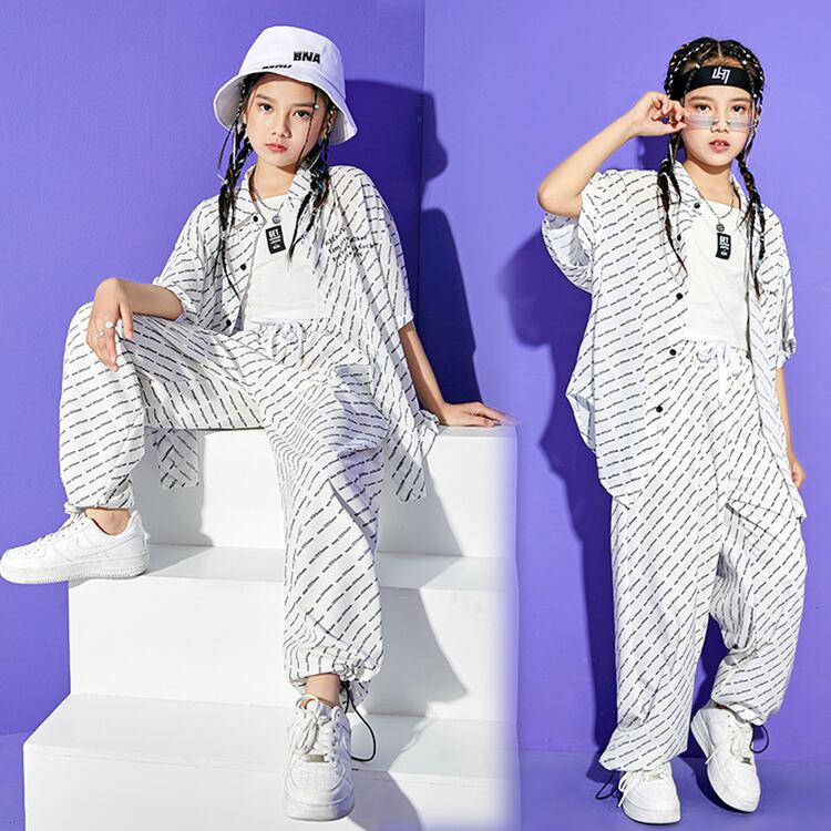 2タイプ 8サイズ ストライプ風総柄半袖シャツ&パンツ バラ売り 上下別売り キッズダンス衣装 シースルー 長ズボン ホワイト ロゴ ヒップホップ レッスン着 練習着 カジュアル ストリート