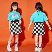 3タイプ 8サイズ 半袖ショートトップス&ブロックチェックミニスカート へそ出し ショート丈 ひざ丈スカート ガールズ 女子 ロゴ かわいい 切りっぱなし Tシャツ ブルー ラベンダー