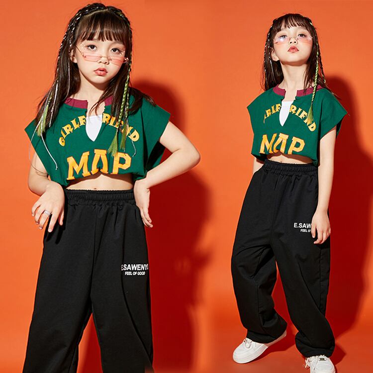 2カラー 8サイズ ノースリーブショートトップス キッズダンス衣装 トップスのみ インナー一体型 へそ出し ショート丈 ガールズ 女子 ロゴ かわいい Tシャツ ブルー グリーン
