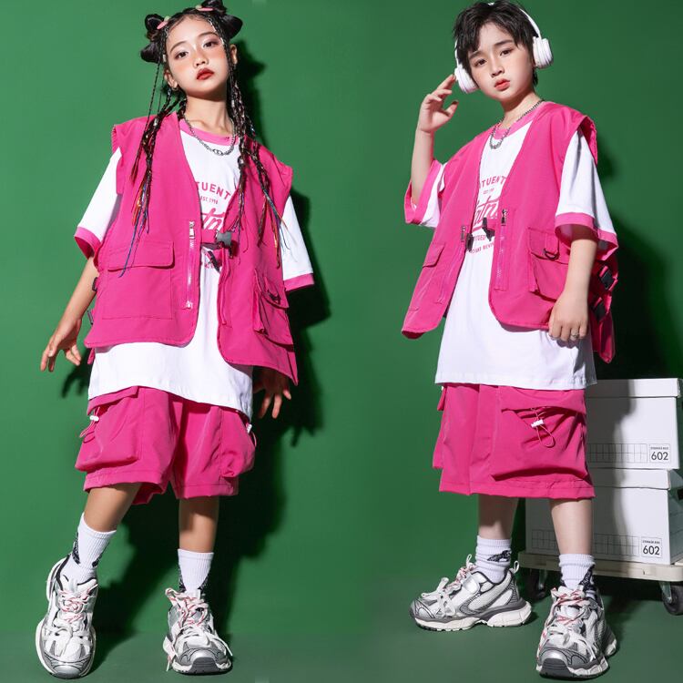 4カラー 8サイズ キッズベスト マルチベスト ベスト 袖なし チョッキ ポケット付き 大きいポケット キッズダンス衣装 ゆったり ヒップホップ レッスン着 練習着