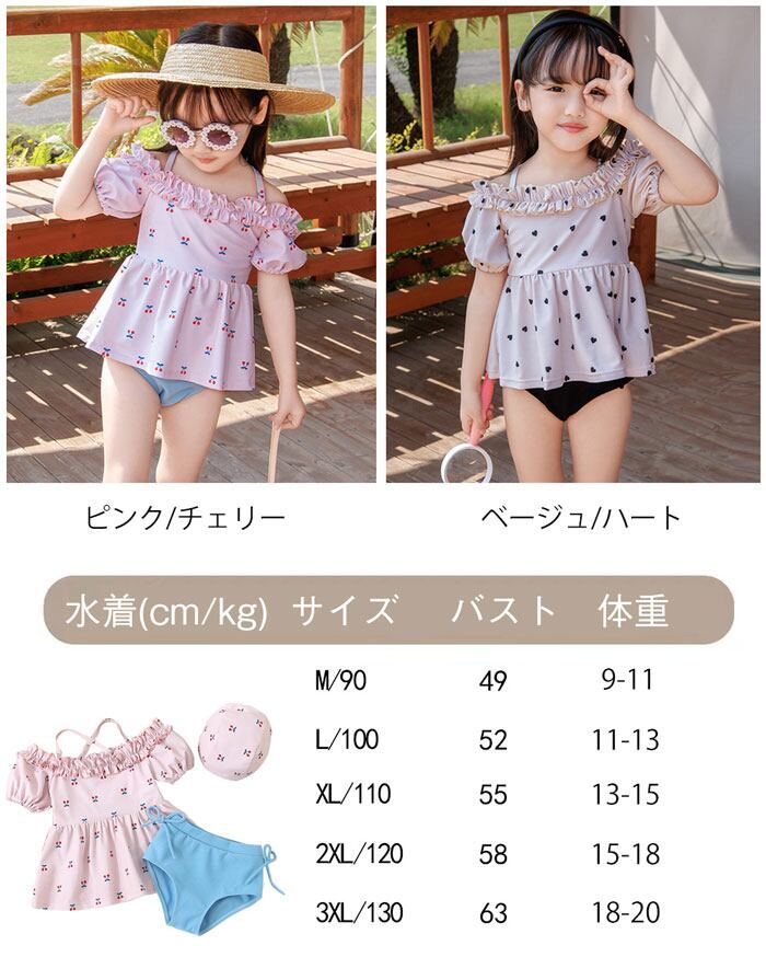 キッズ水着 女の子 キャップ付き スクキッズ ベビー マタニティ 割引horizontal-key: ピンク/チェリー ベージュ/ハート vertical-key: M/90 L/100 XL/110 2XL/120 3XL/130