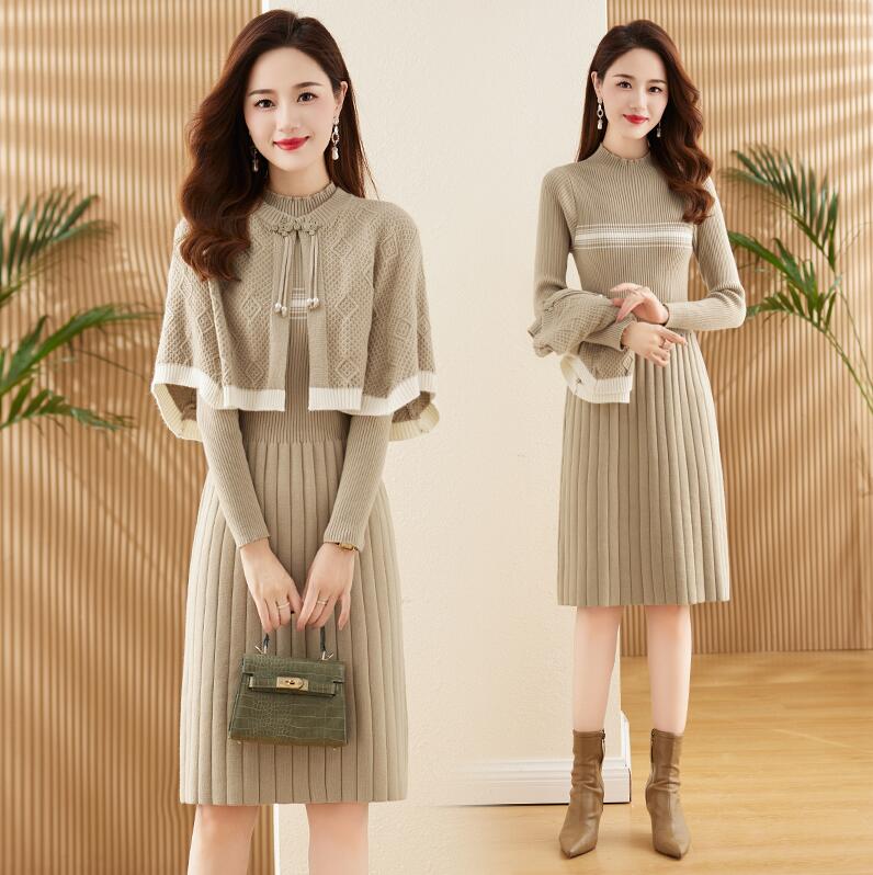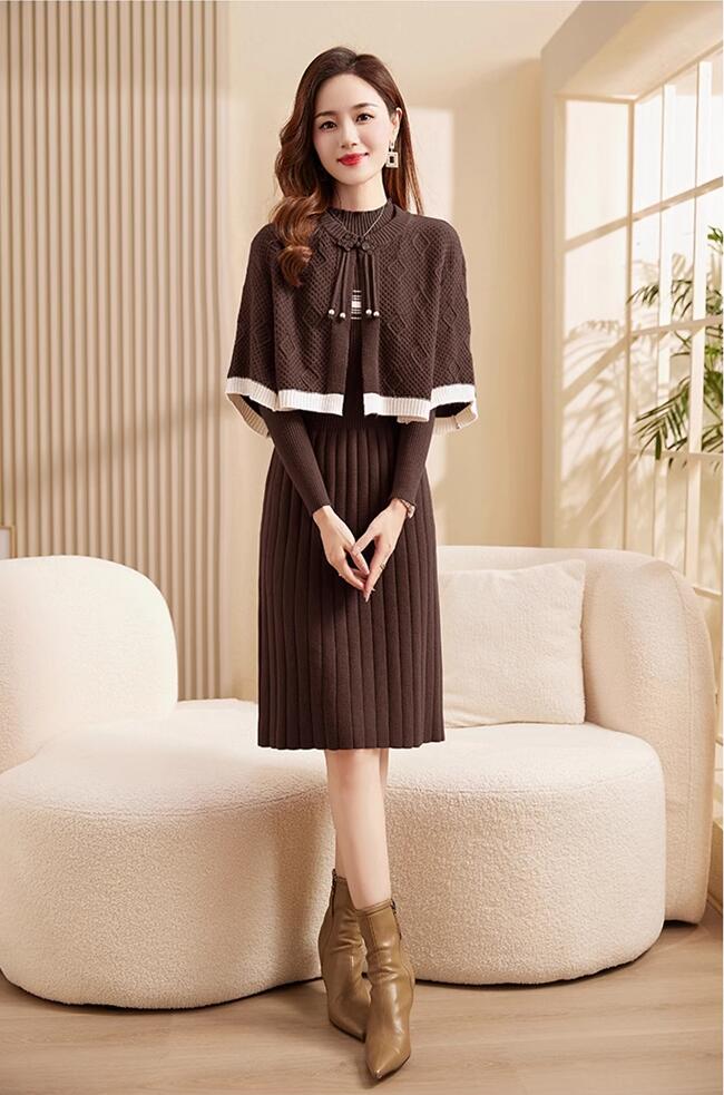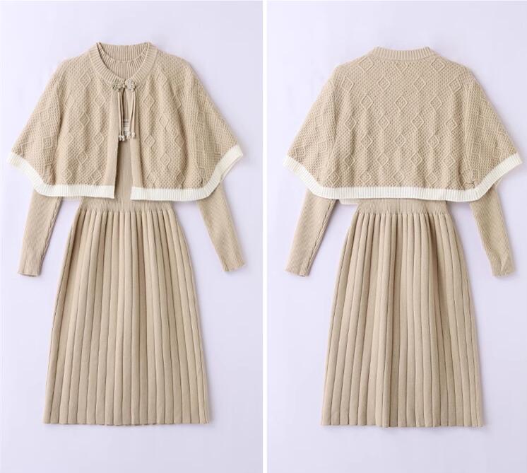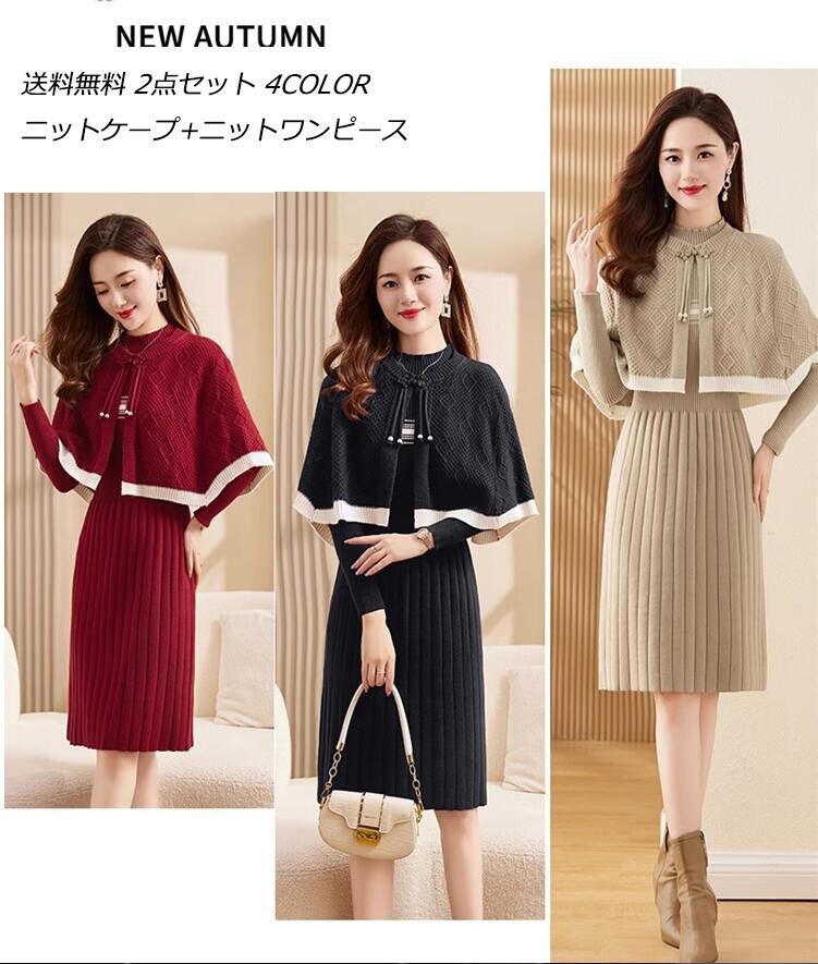 秋冬 新発売 品質良い 4Colors 2点セット サイドリボンケープニットベスト&リブニットワンピース セットアップ ニットベスト 着回しマキシ丈 S M L XL ニットケープ
