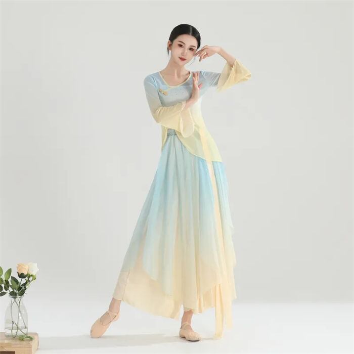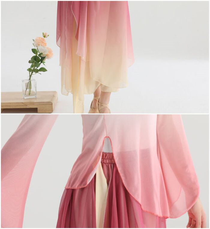 古典舞踊 ダンス衣装 中華民族ダンス 古典漢唐風 演目衣裳 長袖 シフォン重ねフリル キュロット ワイドパンツ 中華ダンス 衣装 配色 バレエ モダン