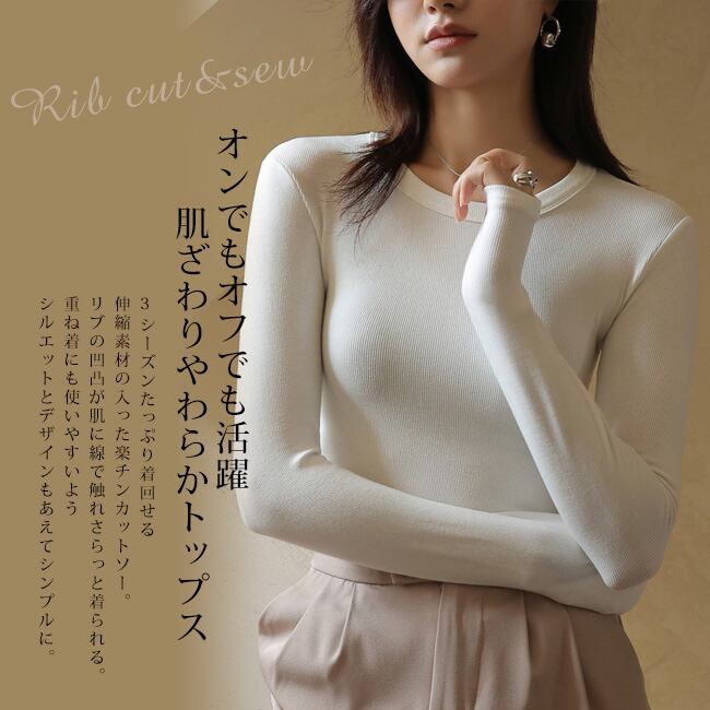 ・ 直線的な胸元が潔い女性らしさを引き立てるクルーネックのリブカットソー。