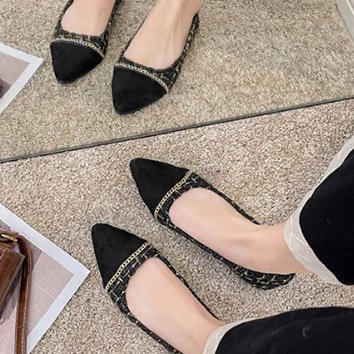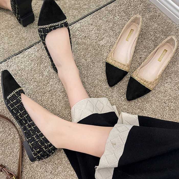 商品についてスエード生地とツイード風生地に合金チェーン、上品でお洒落な異素材mixパンプス