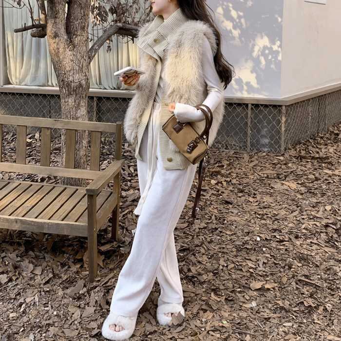 商品についてシーズンムード高まるふわふわな肌触り、ずっと触っていたくなるフェイクファー素材とちくちくしない上質ニット素材で仕上げた異素材mixジレ