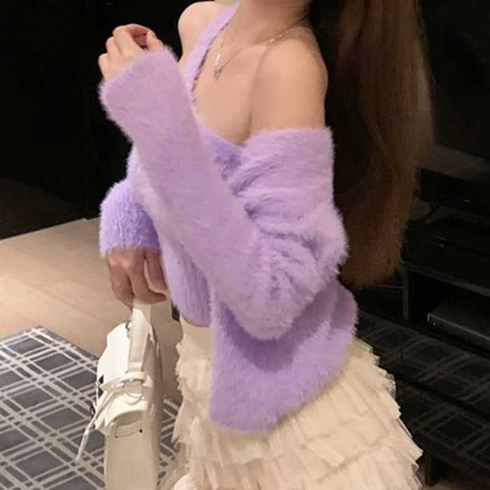 商品についてワンショルダーデザインのニットビスチェにショート丈長袖カーディガンのミンクファー風ニットトップス2点セット