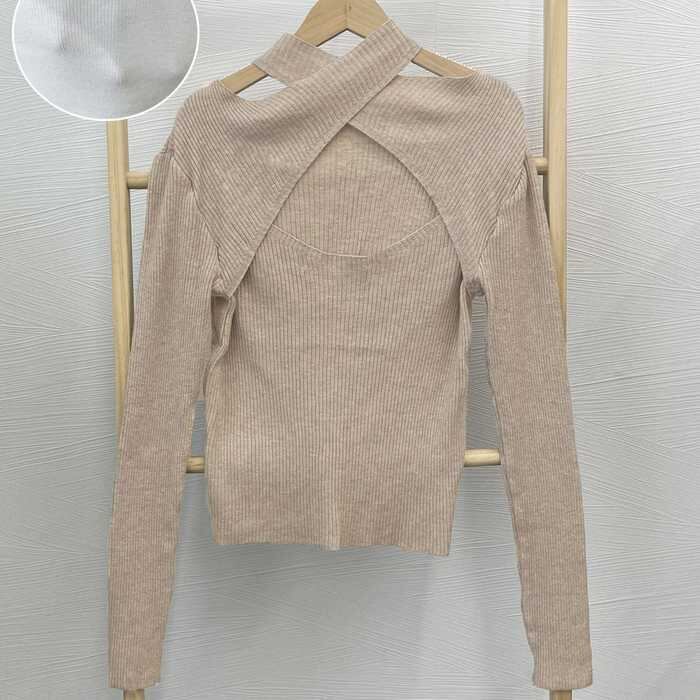 商品についてフロントの肌みせデザインが目を惹くホルターネックニットトップス
