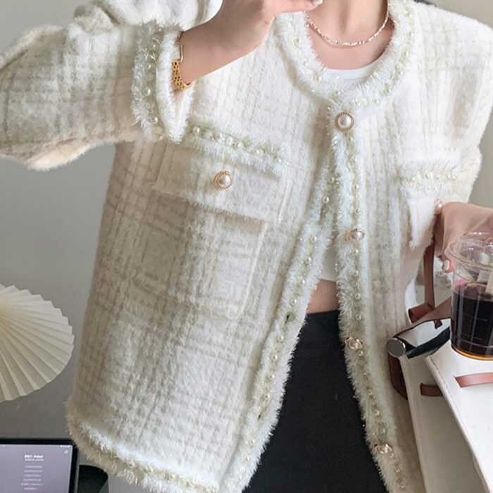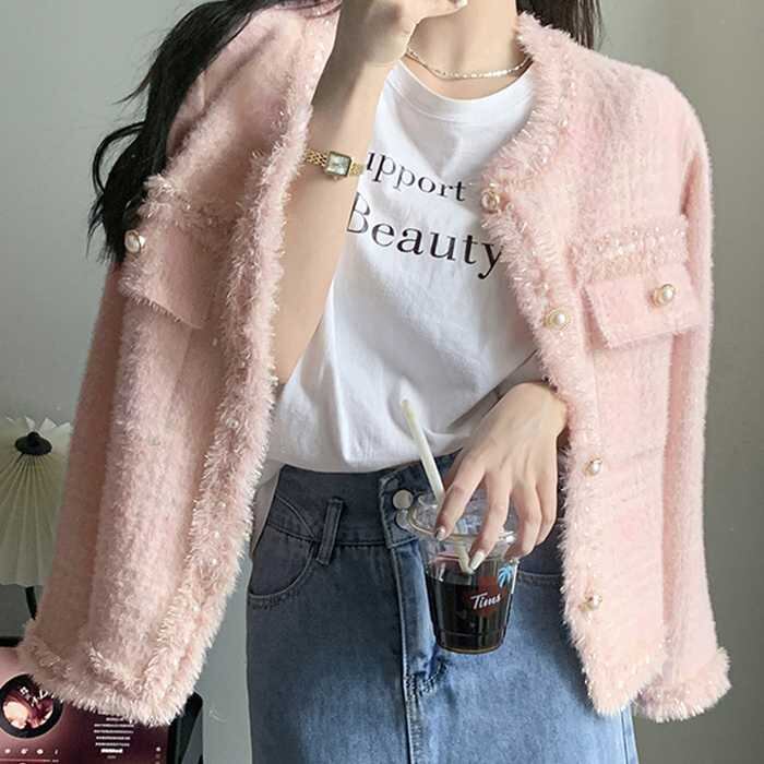 ラメツイード風ジャケット 韓国ニット秋レディースファッション 豊富な品揃え1: ブラック アイボリー ピンク ミントグリーン