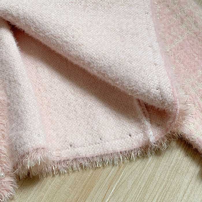 ラメ糸を織り込んでいるので上品な輝きを放ち、縁にあしらったフリンジとフェイクパールボタンは清楚女子のフェミニンテイストをPLUS