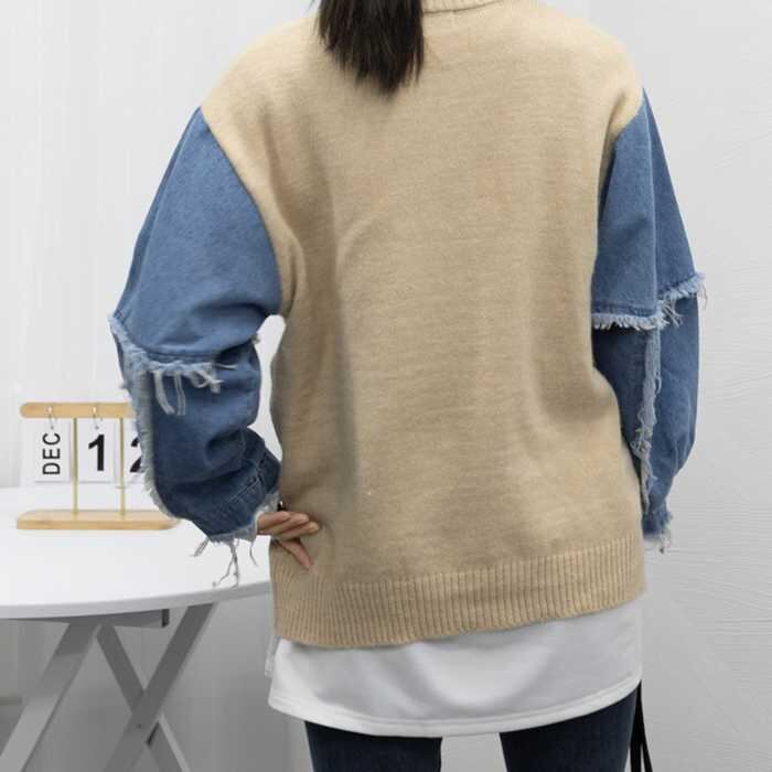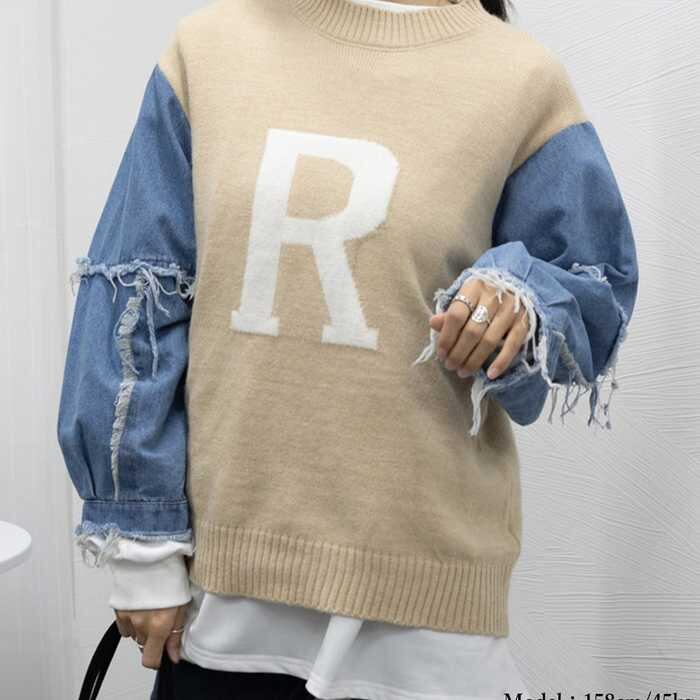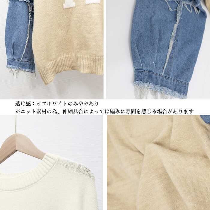 ドッキングニット デニムシャツ 切り替えドッキングトップス デニム袖ニット人気 重ね着風 セーターレディースファッション トップス ニット セーター セーター