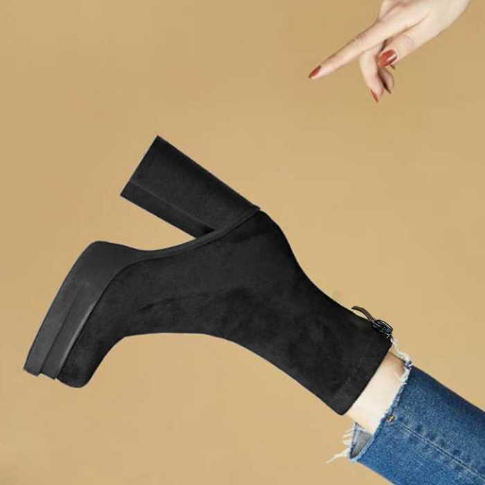 商品についてシーズンライクなスエード調素材にエコレザーチャンキーヒールの異素材mix仕様、お洒落だけでなく安定感も抜群の韓国っぽショートブーティ