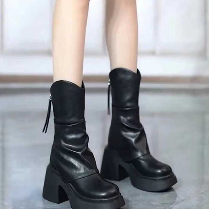 商品について美しさを追求したフォルムに脱ぎ履きしやすいバックジップ仕様、重厚感があってしっかりした韓国っぽ新作レザーブーツ