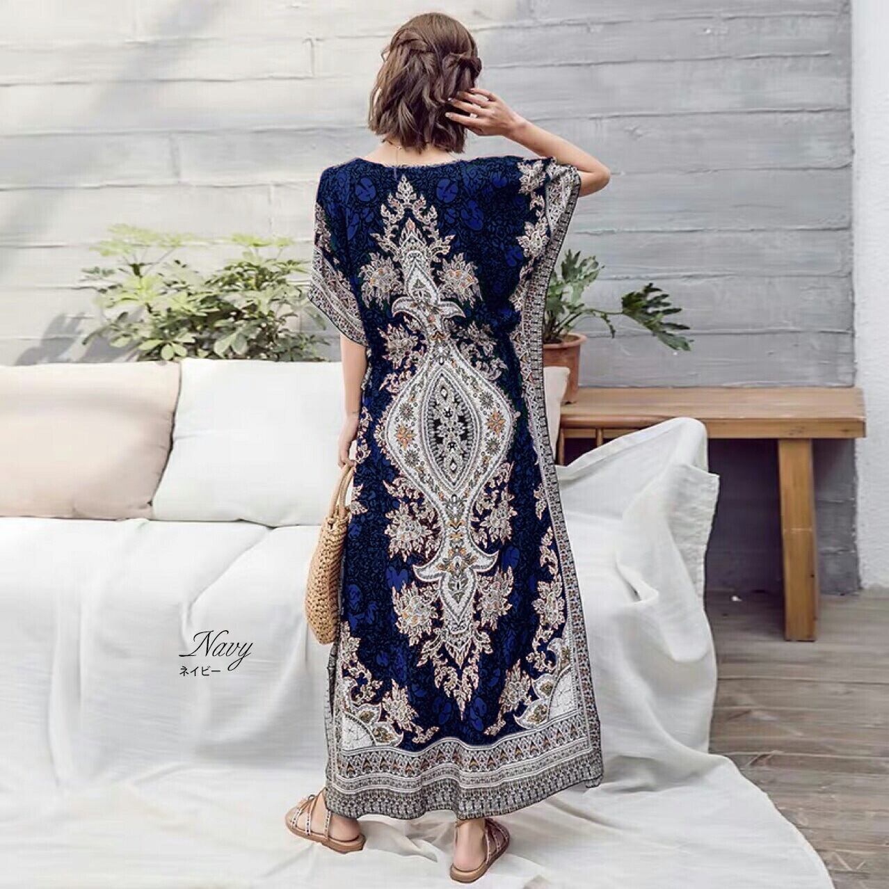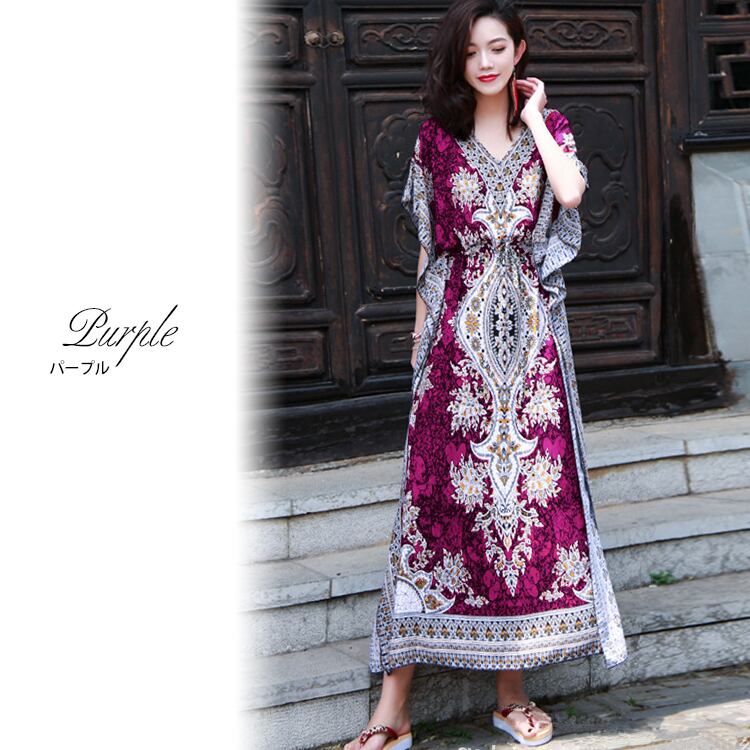 フリーサイズ Vネック ボタニカル柄マキシ ペイズリー柄マキシ ウエスト紐付 ロング丈マキシ ボタニカル柄 ロング丈マキシワンピース カラフル レディース リゾート