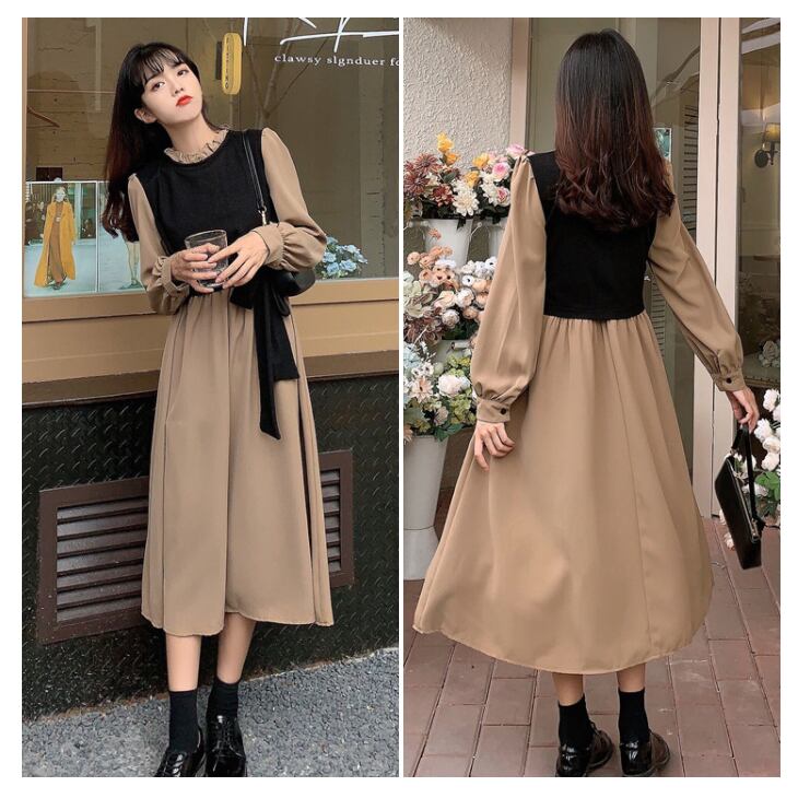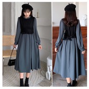 2カラー 3サイズ レイヤード風 長袖フレアワンピース フリルネック ニット ベスト風 くすみカラー Aライン ウエストマーク 着痩せ ミレモ丈 ブラウン ネイビー レディース