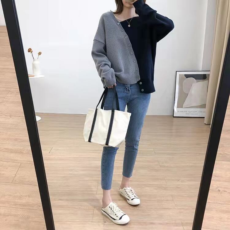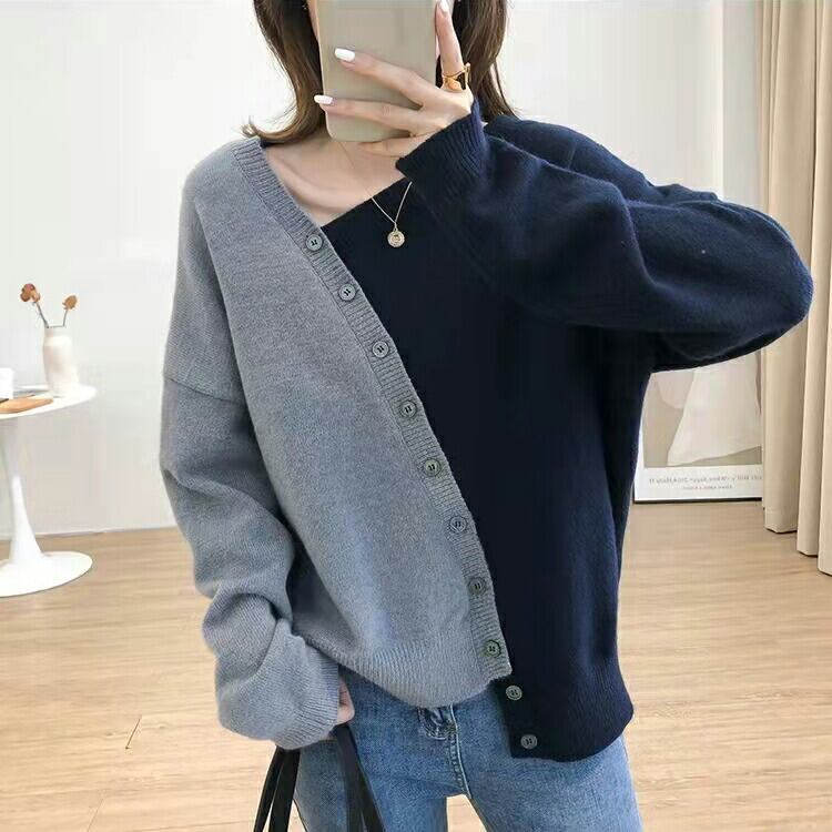 2カラー ボタンデザインバイカラーニット トップス ニットセーター 長袖 Vネック プルオーバー トップス ネイビー ブラウン レディース