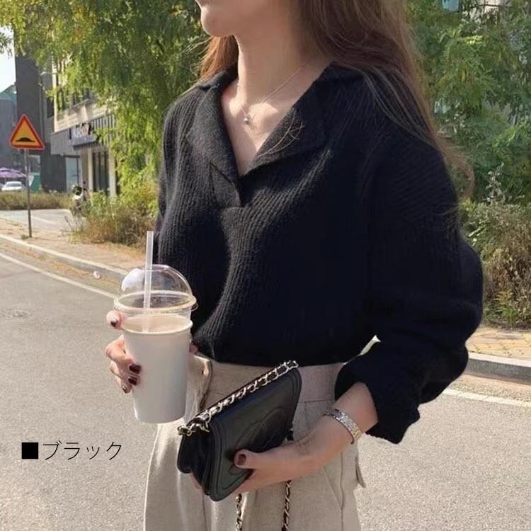 5カラー 襟付きニットセーター トップス ニットセーター 長袖 Vネック グレー ブラック ブラウン アイボリー ミント リブ ローゲージ プルオーバー レディース