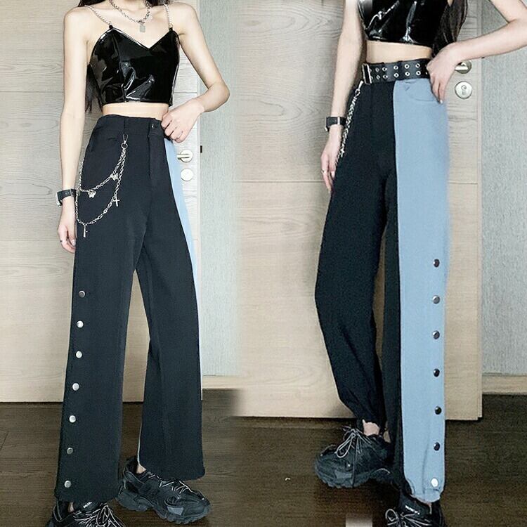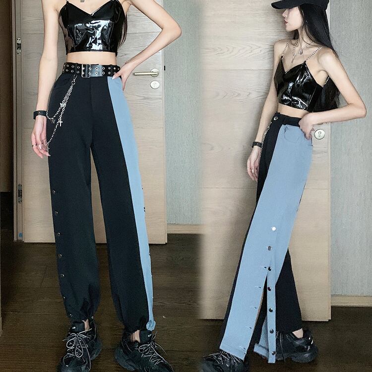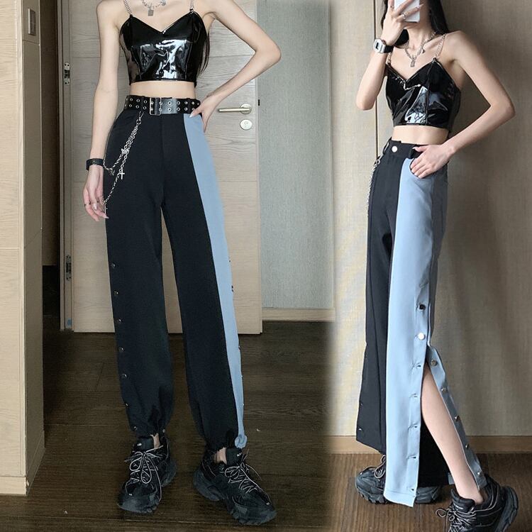 サイドボタンストレートパンツ 切替 アシメデザイン ボトムス トラックパンツ チェーン アクセサリー ブラック ダンス ストリート 衣装 裾 ドローコード