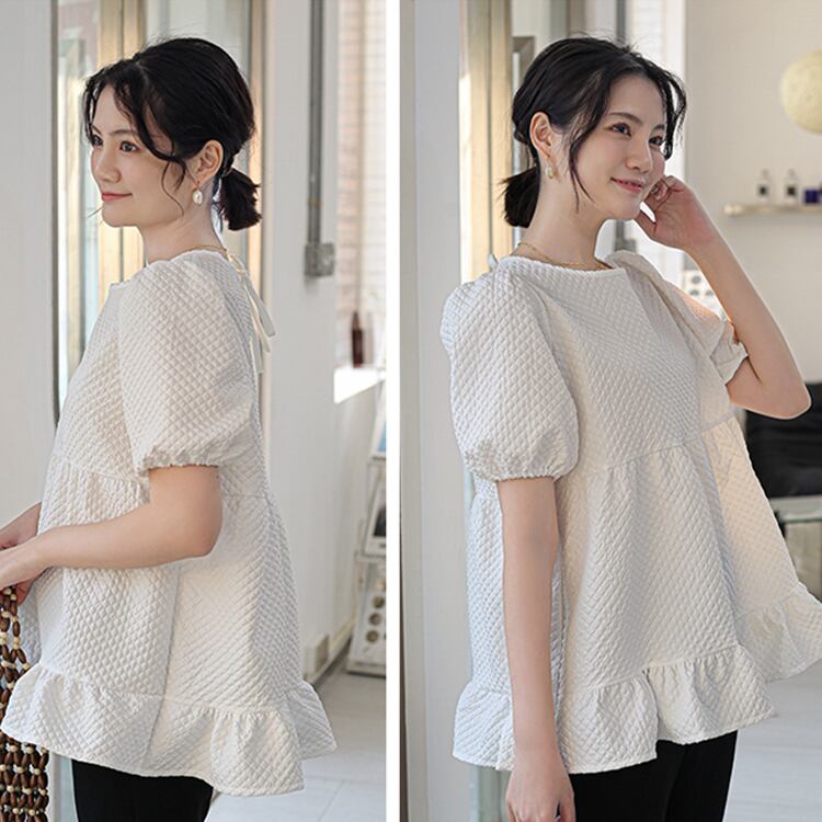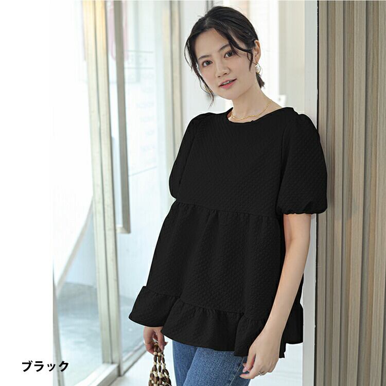 4カラー パフスリーブ ペプラム トップス 春 夏 レディース 二の腕カバー パフ袖 バルーン袖 半袖 裾フリル リボン かわいい 春夏 トップス おしゃれ きれいめ 大人 可愛い