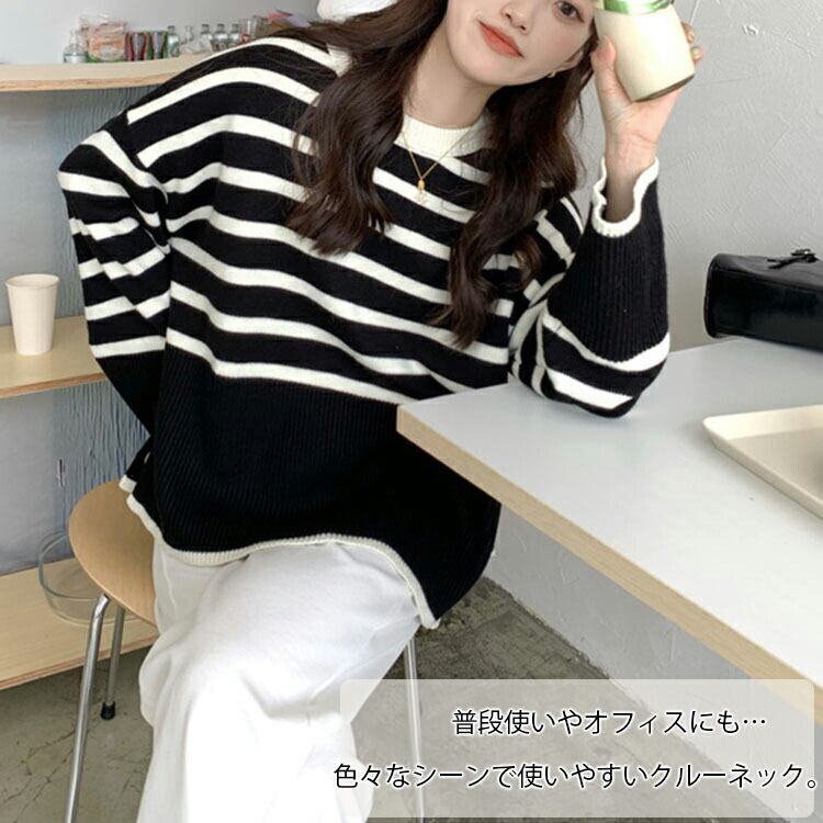 パネルボーダーニット クルーネック 秋冬 レディース トップス ボーダーニット 暖かい 長袖 サイドスリット ゆったり 防寒 大人可愛い きれカジ