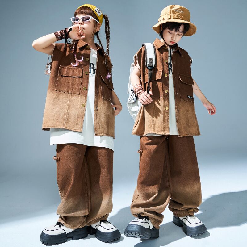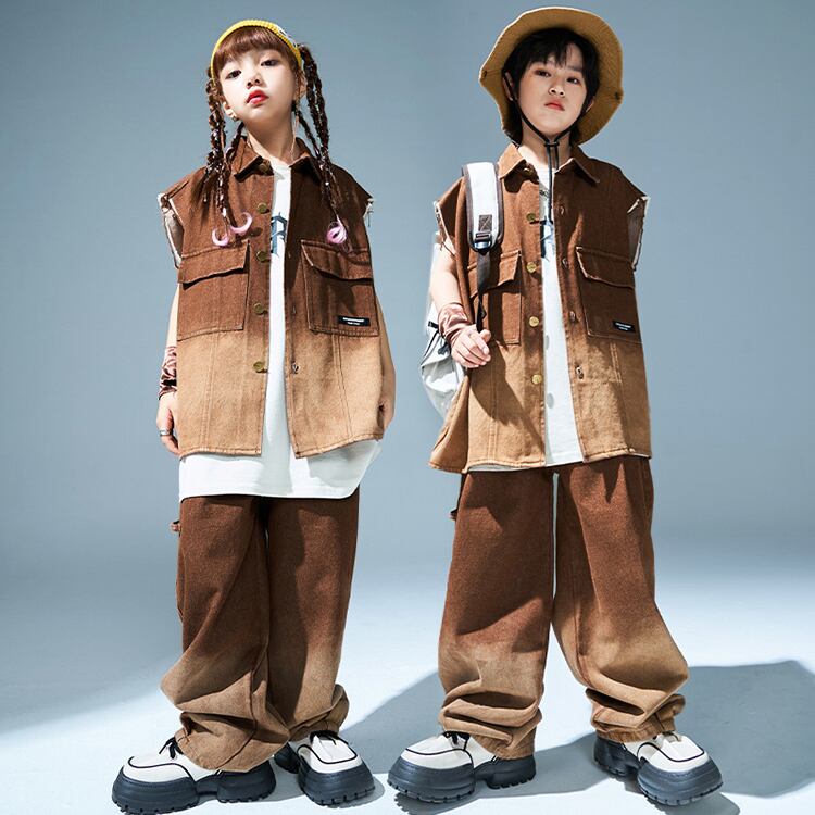 2タイプ 8サイズ キッズ デニム風 グラデーション ベスト パンツ バラ売り 上下別売り セットアップ 袖なし チョッキ 長ズボン キッズダンス衣装 ヒップホップ レッスン着 練習着
