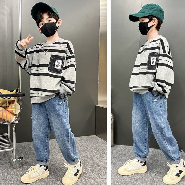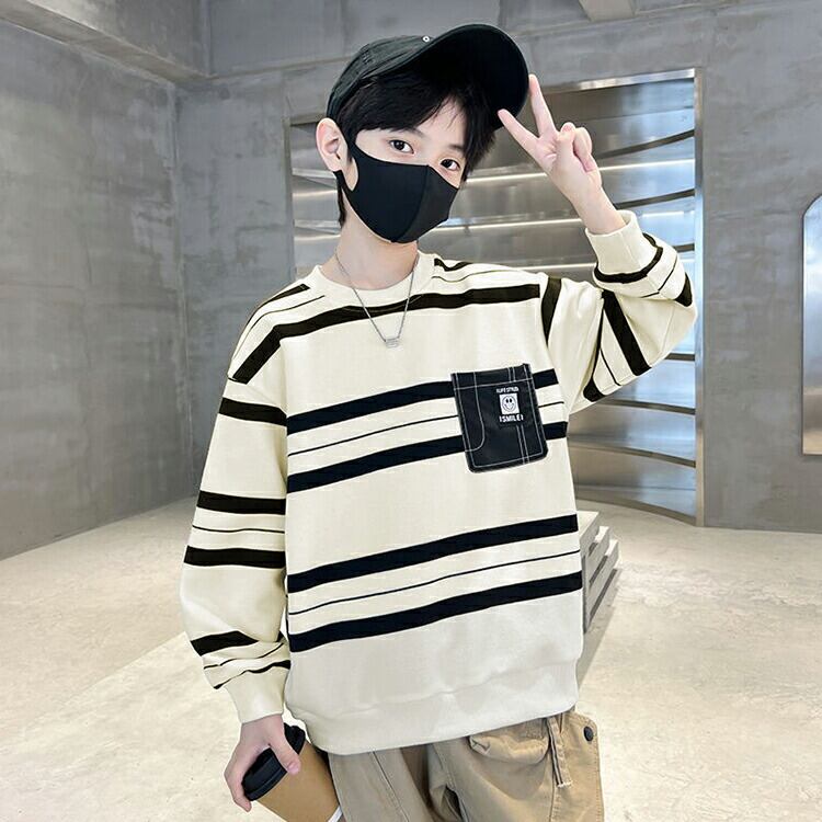 2カラー 6サイズ キッズトップス ボーダー 長袖プルオーバー 秋冬 キッズトレーナー 胸ポケット ニコちゃんマーク ラウンドネック 袖口リブ 普段着 練習着 レッスン着 男の子 女の子