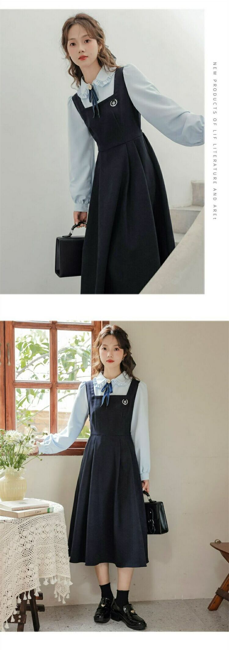 フェイクレイヤード ワンピース ロングワンピース 紺 長袖 卒業式 レディース 制服 女子 スカート プリーツ 入学式スーツ 卒服 韓国 フォーマル 発表会 お受験 入学式ワンピース 丸襟 お花見 お