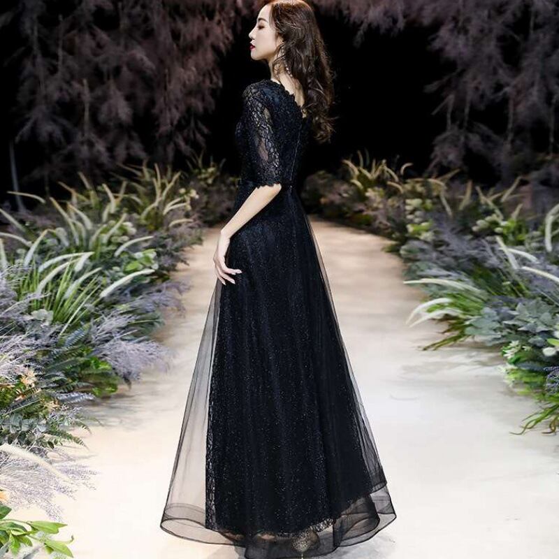 ロング ドレス 演奏会 パーティードレス ブラックドレス レディース 結婚式Vネック ロング丈 発表会 お呼ばれ 二次会 披露宴 上品 高級 黒 マキシ丈5分袖成人式