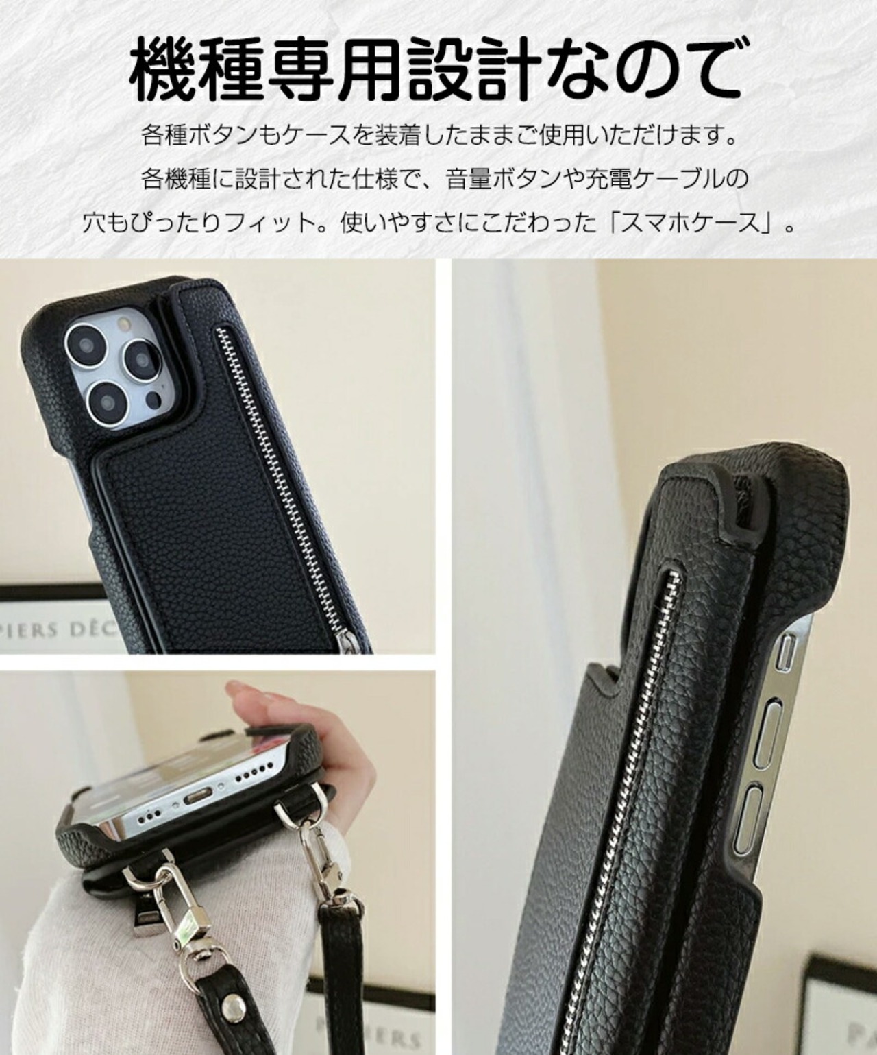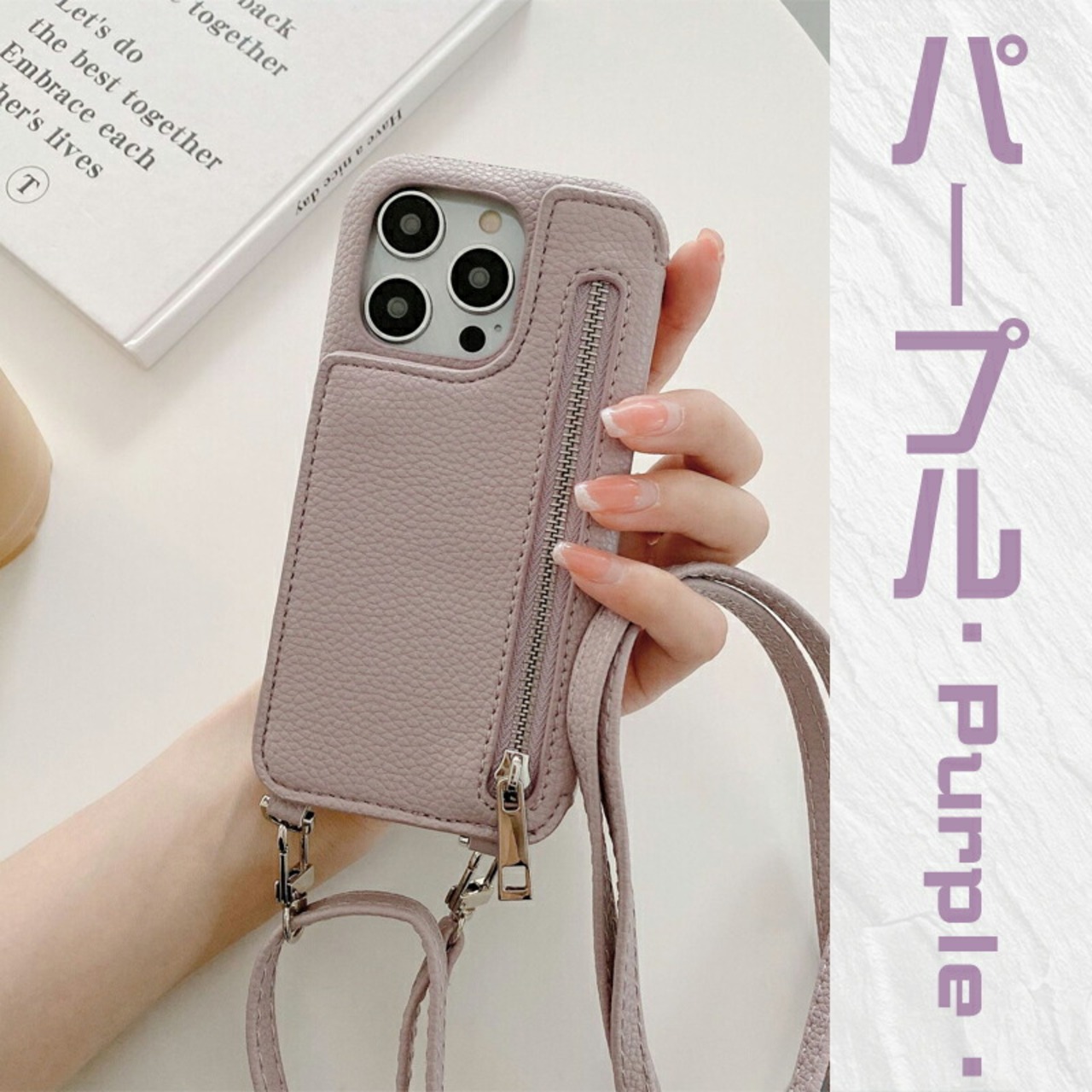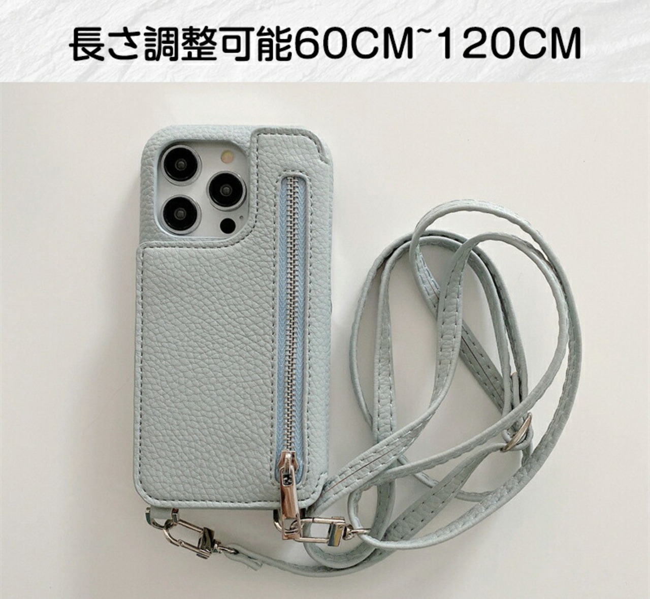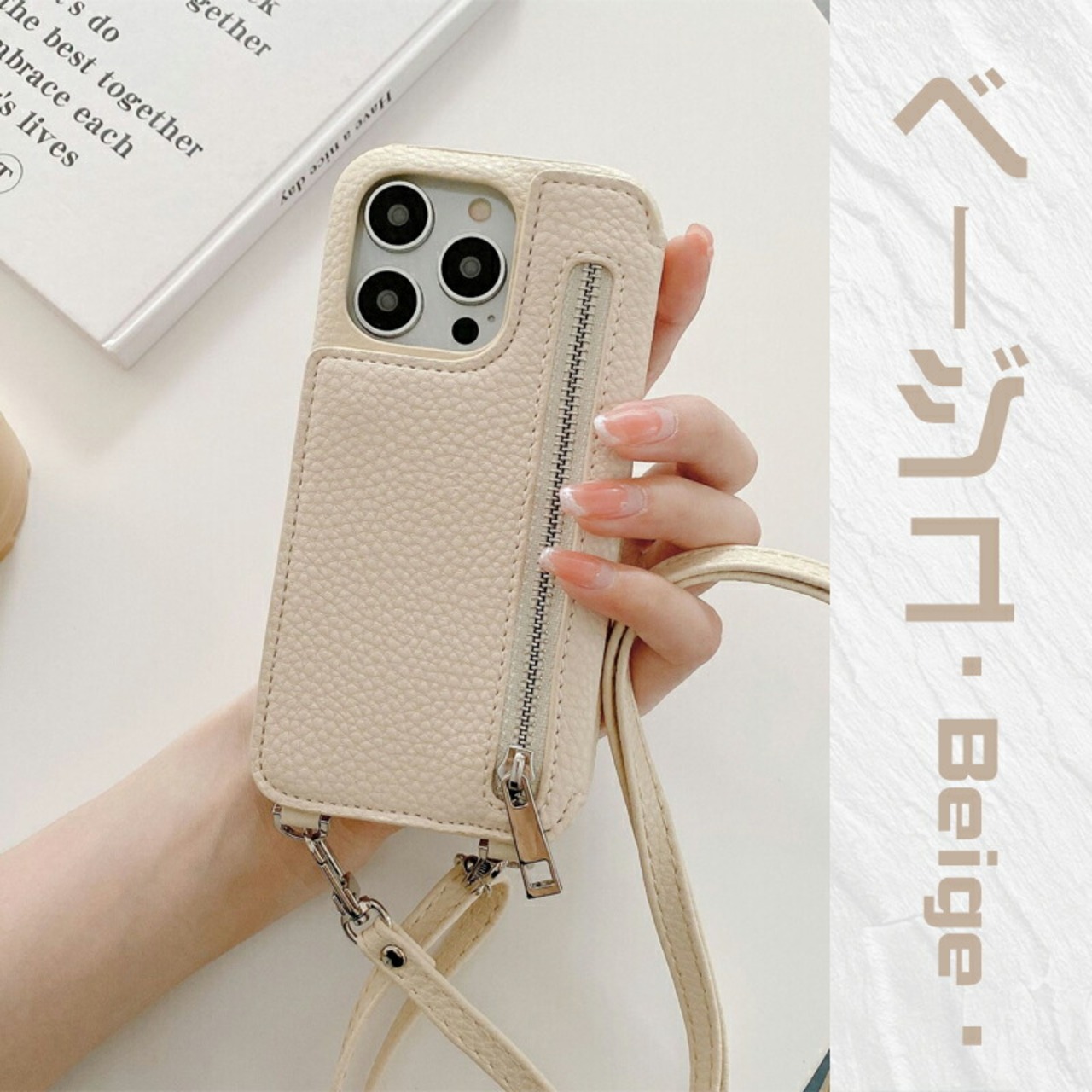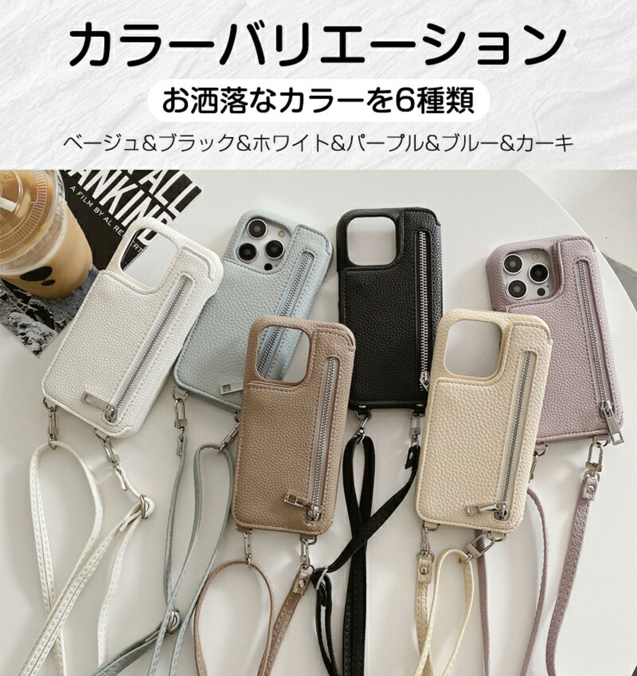 ケースの正面にファスナータイプの収納ポケット付属、ショルダータイプのスマホケースです。