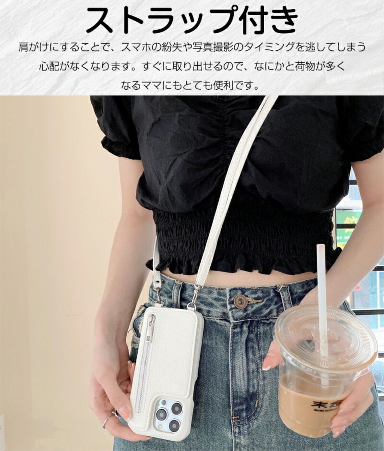 肩掛けができるようショルダーストラップ付きでスマホ本体の落下を防ぎ、シーンに合わせておしゃれに使えます。