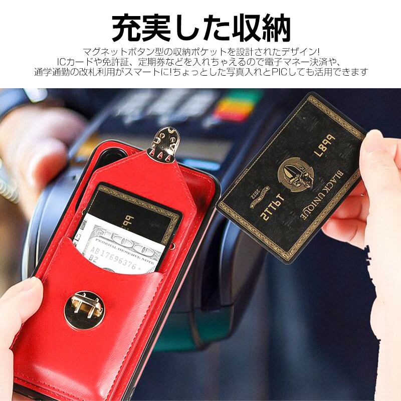 ●特徴1:背面は金属感のある独特の留め金、フリップ式で開閉するカード入れはセキュリティーが高く、複数枚のカードを同時に保護、お財布型としても機能、ショルダーストラップとしても使用可能ちょっとした買い物や散歩、スマホひとつでお出かけもOK