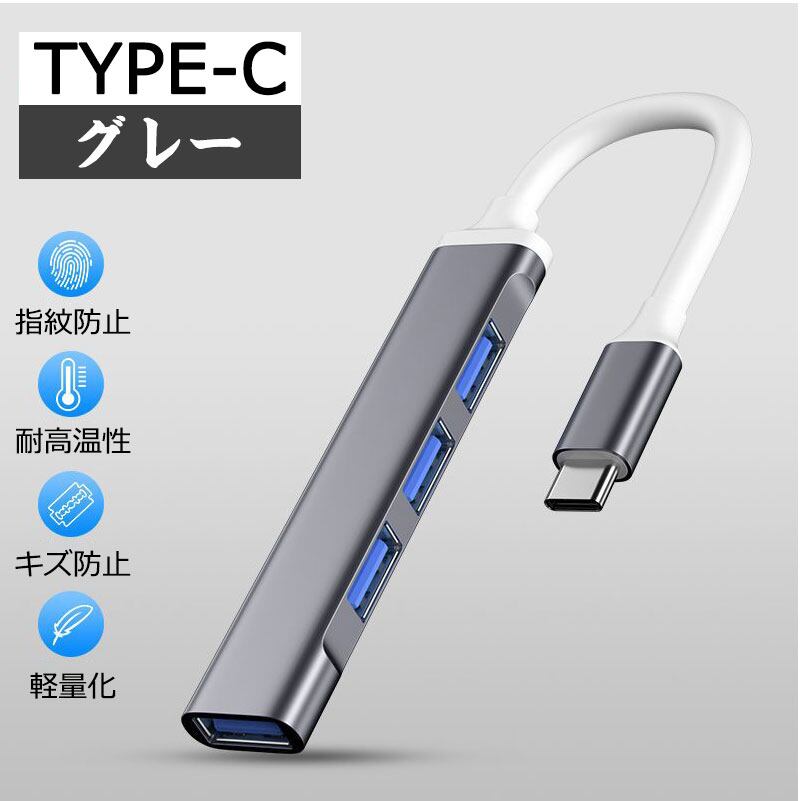 変換アダプタ USBハブ 4ポート 高規格: TYPE-C USB カラー: シルバー グレー