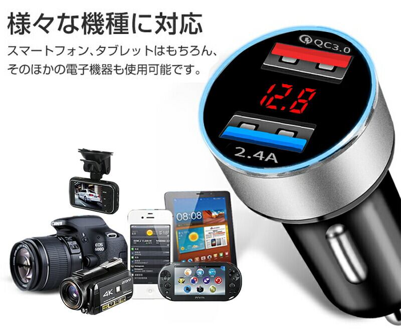 カーチャージャー シガーソケット 急速充電 USB 車載 車 充電器 2ポート 2連 QC3.0対応 デジタル表示 最大出力5.4A スマホ スマートフォン タブレット 12V-24V対応 iphone Android アンドロイド アイフォン ゲーム機 スマホ