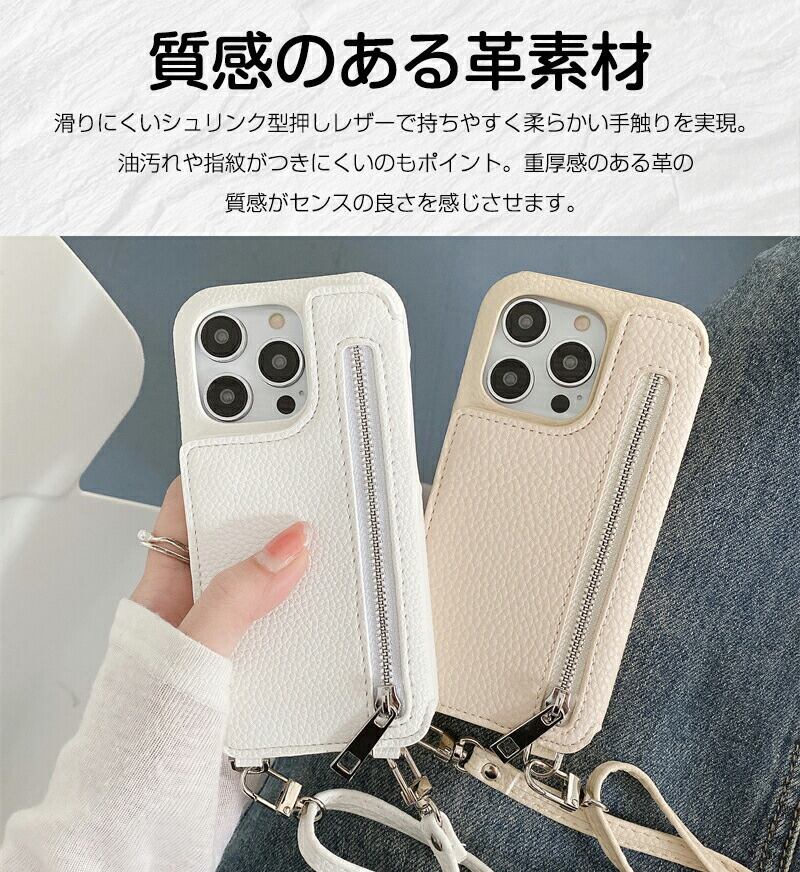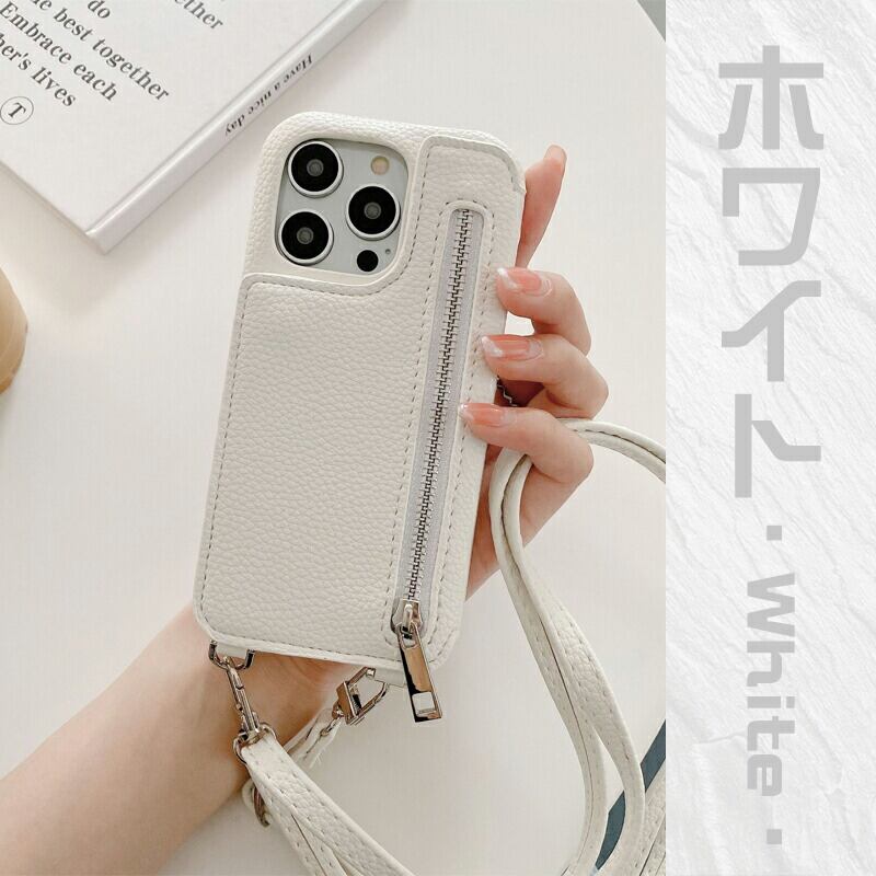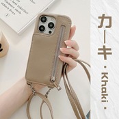 ケースの正面にファスナータイプの収納ポケット付属、ショルダータイプのスマホケースです。