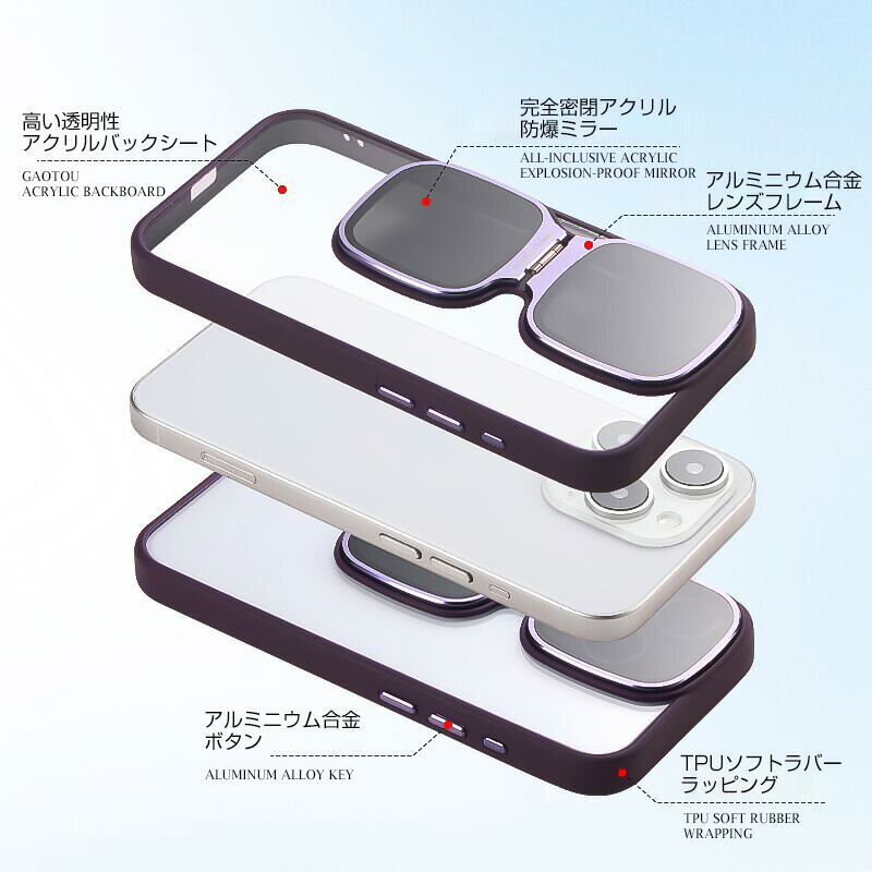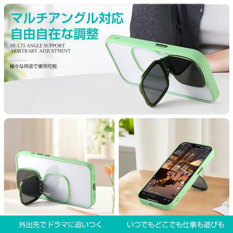 クリエイティブサングラスホルダーケース iPhone15 ケースオールインクルーシブ 透明でシンプルなケース iPhone 14 13 12 11 ケース カメラレンズ保護 スタンド機能付き