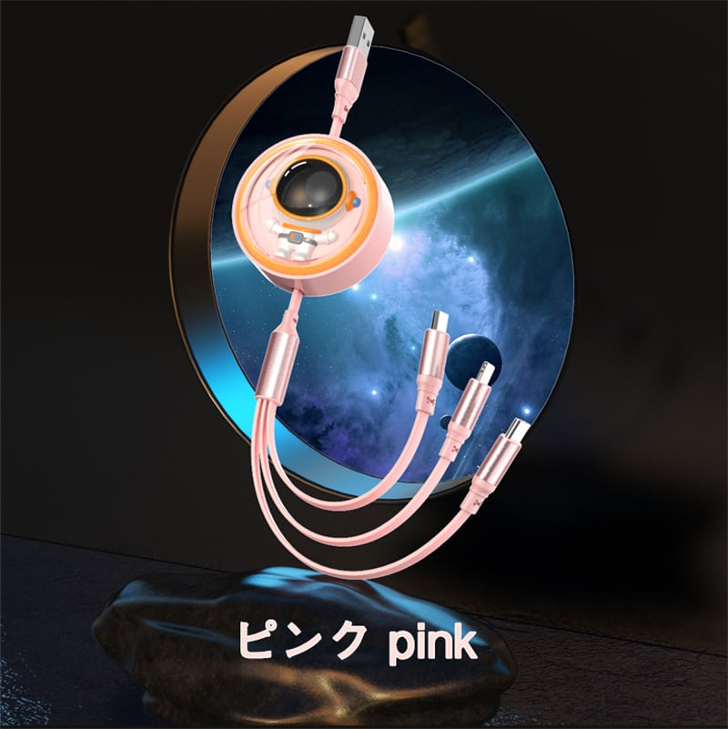 おしゃれで便利な巻き取りタイプ パステルカラー 2色選択可 充電ケーブル 3in1 iPhone Android対応 Lightning Micro USB USB Type-C 同時充電可