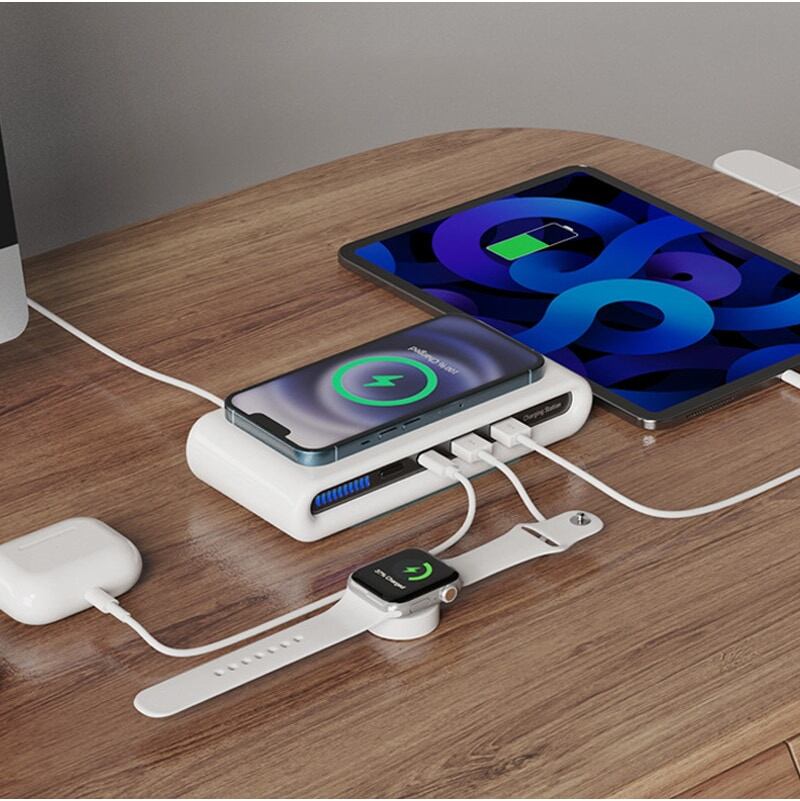 ●ワイヤレス充電器。過電流、過電圧、短絡に対する複数の保護機能を備えており、このマルチポート充電ドックが安全に安心して使用できることを保証します。