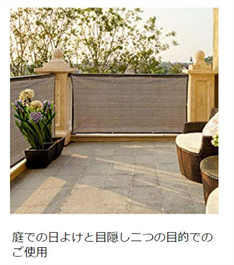 目隠し 遮光 UVカットの3役が備えているシェードです。UVカット率が約85~90%、遮光率が約80~85%、通気性がよくプライベートも守られる目隠しシェードです。遮へい性のニーズにより2枚を重ねて使用するのも可能。ベランダやバルコニーの鉢植、植物などが日光の直射や夏の暑さで枯れたりするのを避けるため遮光シェードとしても使えます。風雨にも耐えられて品質の高いベランダ目隠しシェードです。
