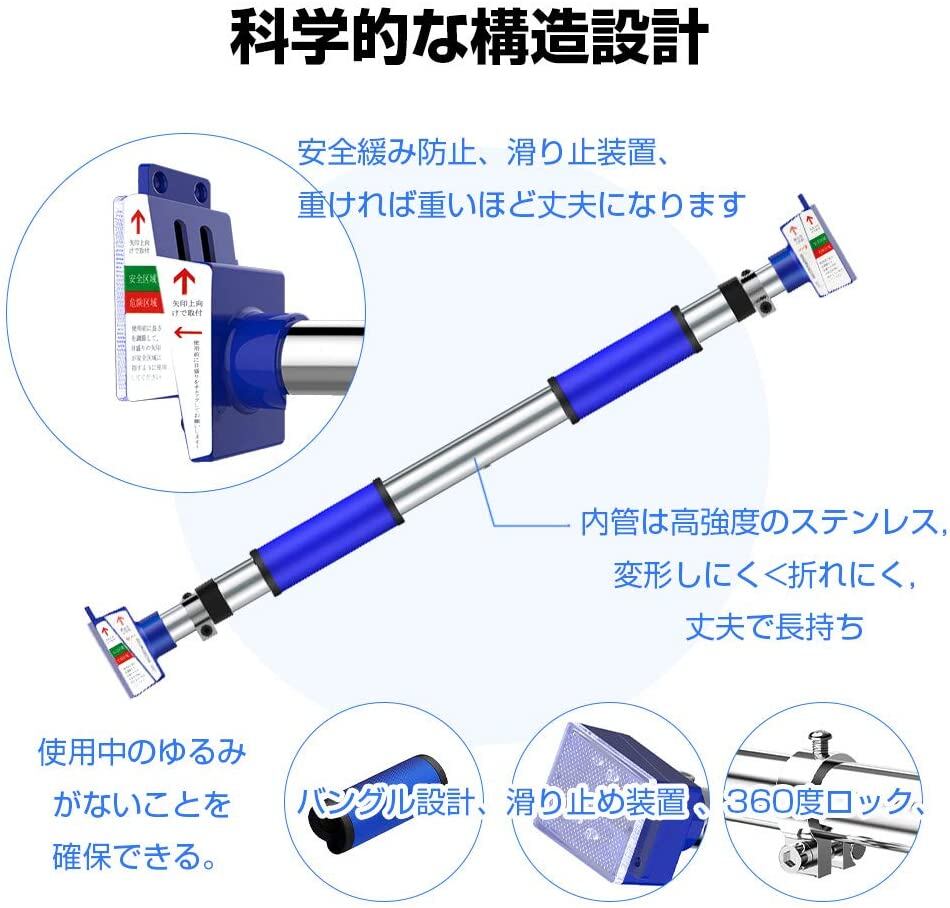 【最新の懸垂バー】本体長さ約72〜93cmで調節可能。耐久重量は300kgまで、ステンレス鋼により変形しにくいです。、工具無しで設置可能、穴あけ不要、ネジ取り付けなし、バーを回転させ突っ張って固定します。