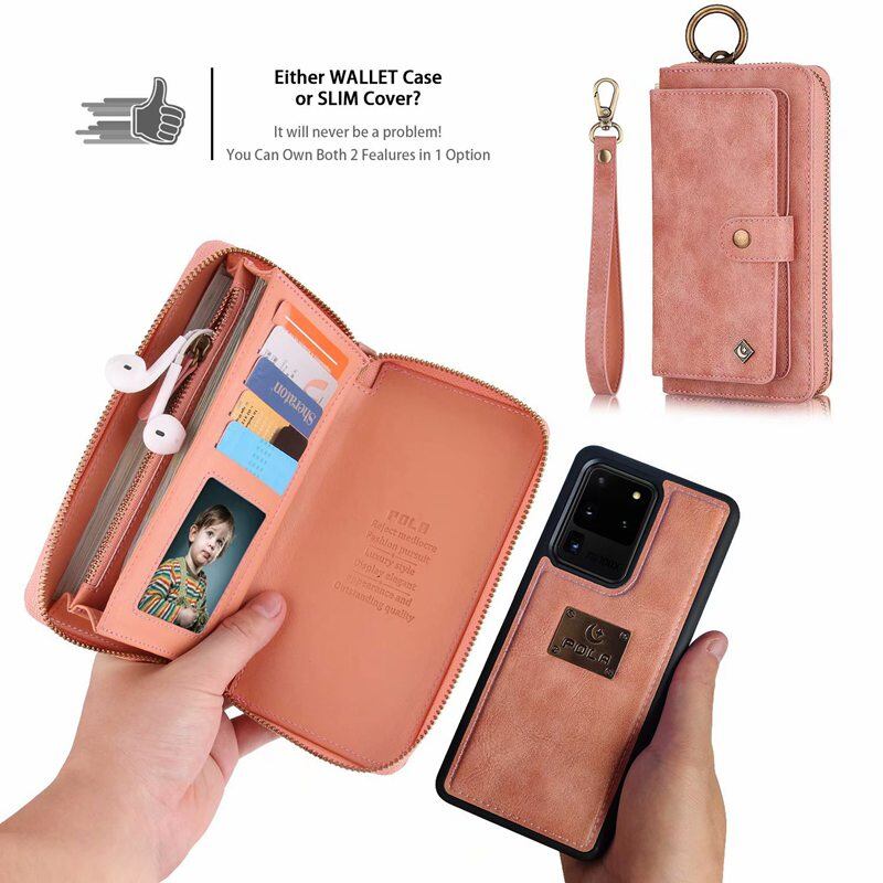 【大容量の財布】高級感あるデザインの財布型ケースの外側にカードポケット付き、内側に二つポケット、ファスナーポケットとカード入れがあります。14枚のカード、コイン、お札とスマホ1台を同時に収納できます。