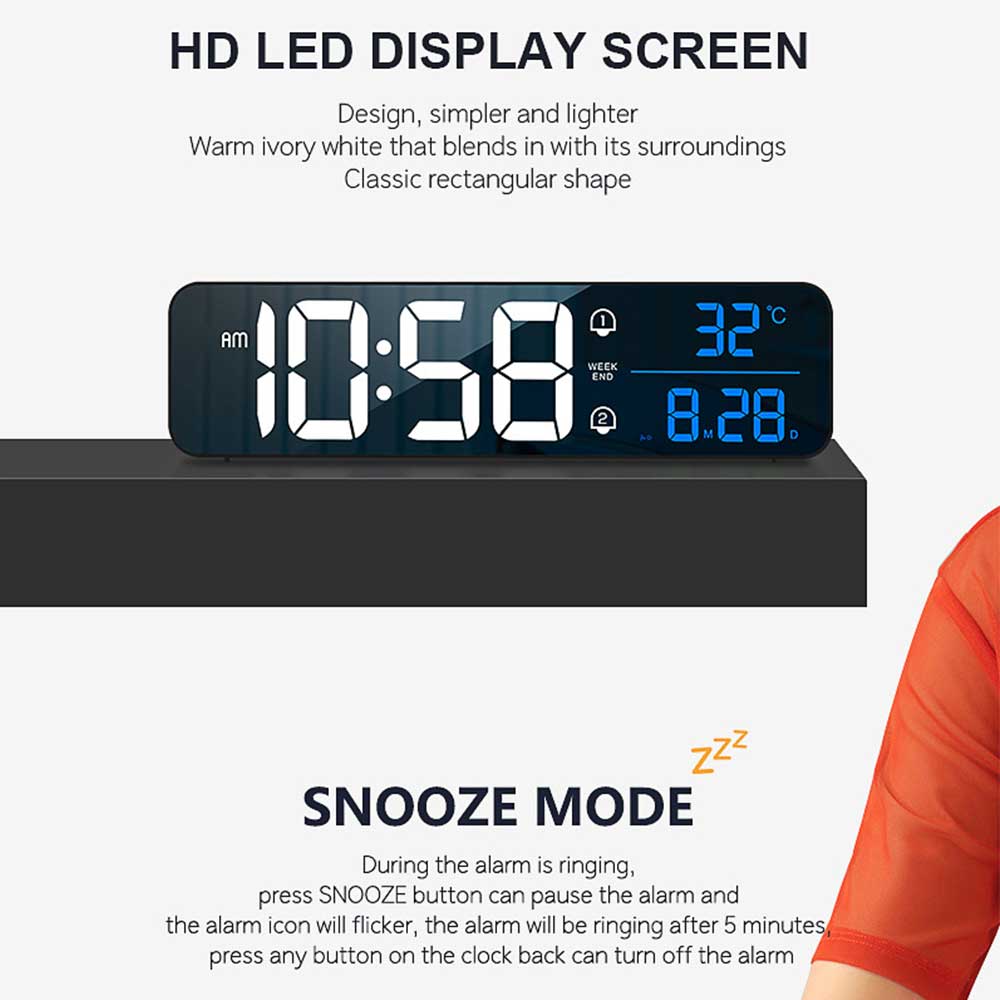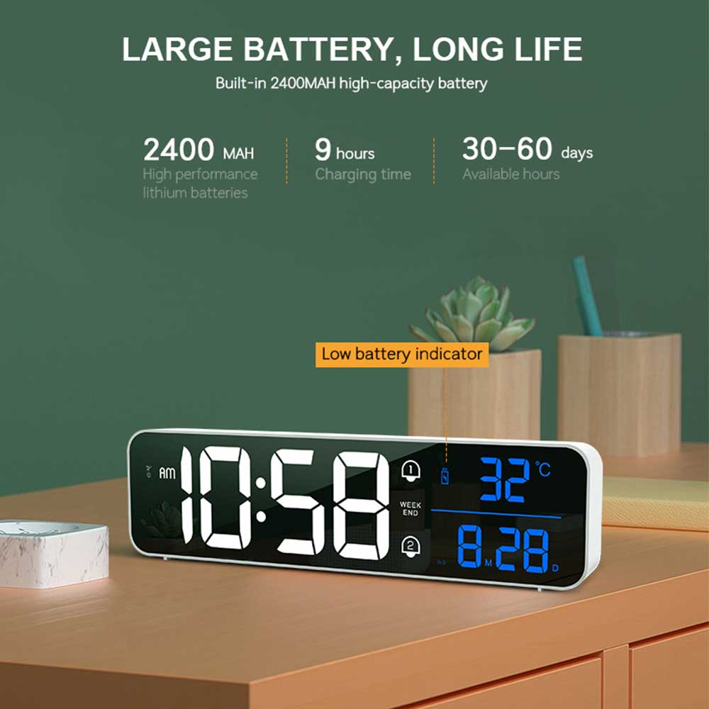 【多機能デジタル時計】(1)12/24H時間表示 (2)(℃)温度表示 (3)音声感知機能 (4)カレンダー (5) 2種類のアラーム (6)USB充電 (7)スヌーズ機能 (8)明るさ5段階調節 (9)40種音楽ベル(10)2400mAh大容量バッテリーで(11)WEEKENDモードも設定できます