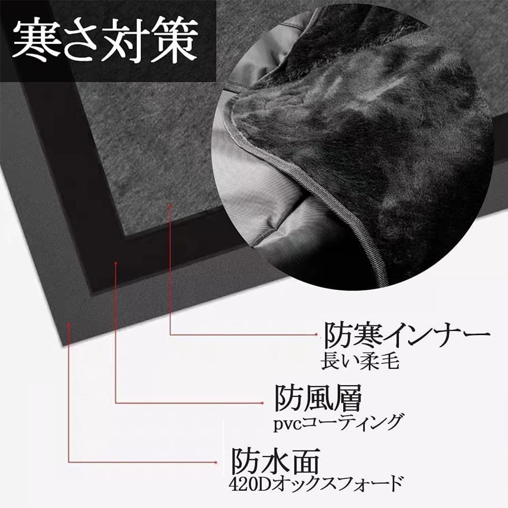 【防風性に強い!】胸からつま先まで覆う防寒のエプロンカバー設計で、正面から冷たい強風を軽減し、十分に防風効果があります。表面撥水生地で、小雨もご安心にお使えます。