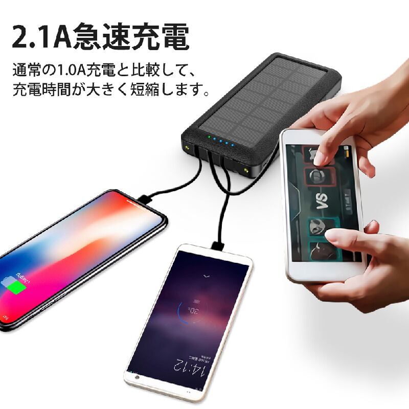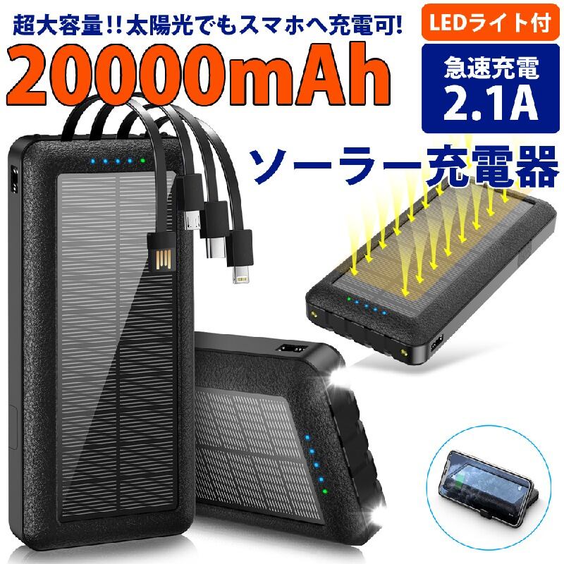 種類ケーブル内蔵 20000mAh 4台同時充電PSE認証 ソーラーモバイルバッテリースマートフォン タブレット バッテリー 充電器 モバイルバッテリー