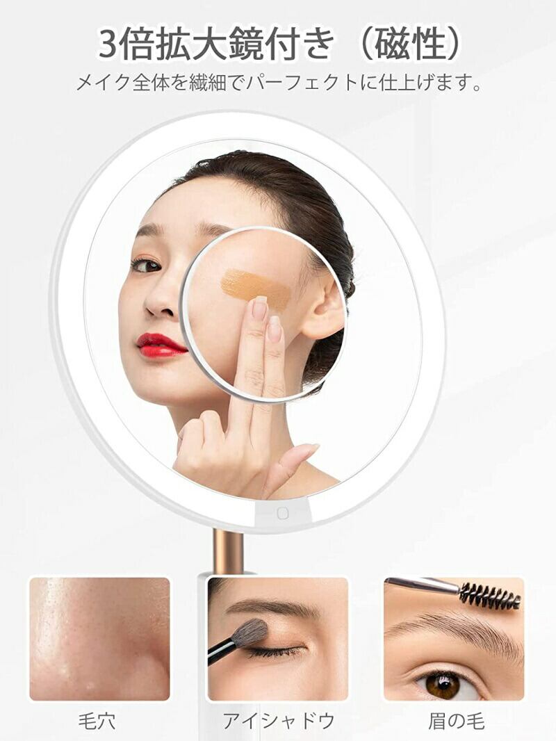 化粧鏡 LED 高演色RA95 タッチパネル 5000k 無段階調光 0-55 mm縦方向に高度調整でき 40°角度調整可能 3倍拡大鏡付き 大容量充電式バッテリー 化粧ミラー メイクミラー 白い