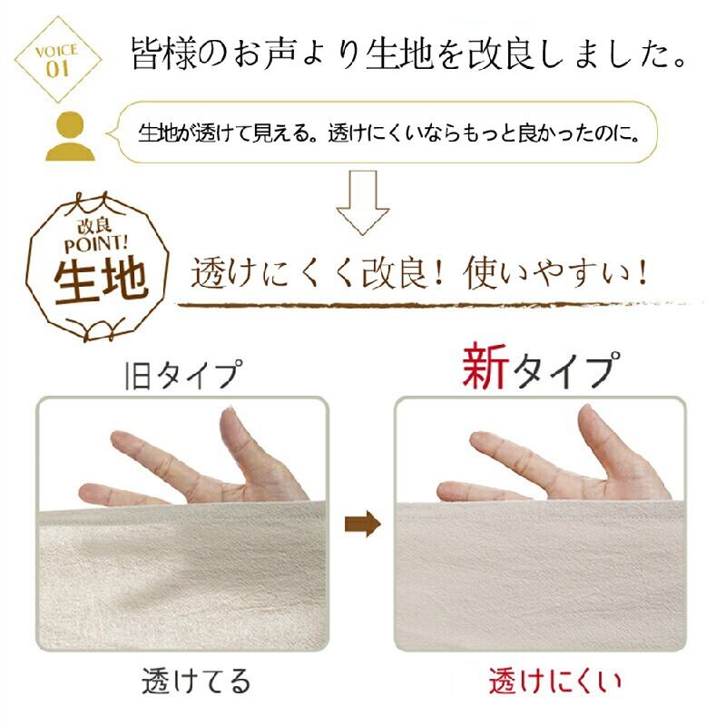 ●コットン:80%、リネン:20%。綿(コットン)と麻(リネン)を混ぜて織り上げた、2つの天然素材を”いいとこ取り”した素材です。リネンは、繊維の中に汚れをはじく成分「ペクチン」を含んでいるため、汚れがつきにくく落ちやすいという性質があり、お手入れがしやすいです。また、軽くて風をお通しやすく「爽やかな」素材です。これにコットンを混ぜることで「柔らかさ」をプラスし、ふんわりと優しい肌あたりで、さらに心地よい生地となっています。 コットンを多めに配合することで、ペラペラ感は一切なく、ふんわり感のあるしっかりと生地に。比較的しわが気になりにくく、型くずれにも強いのが特徴です。