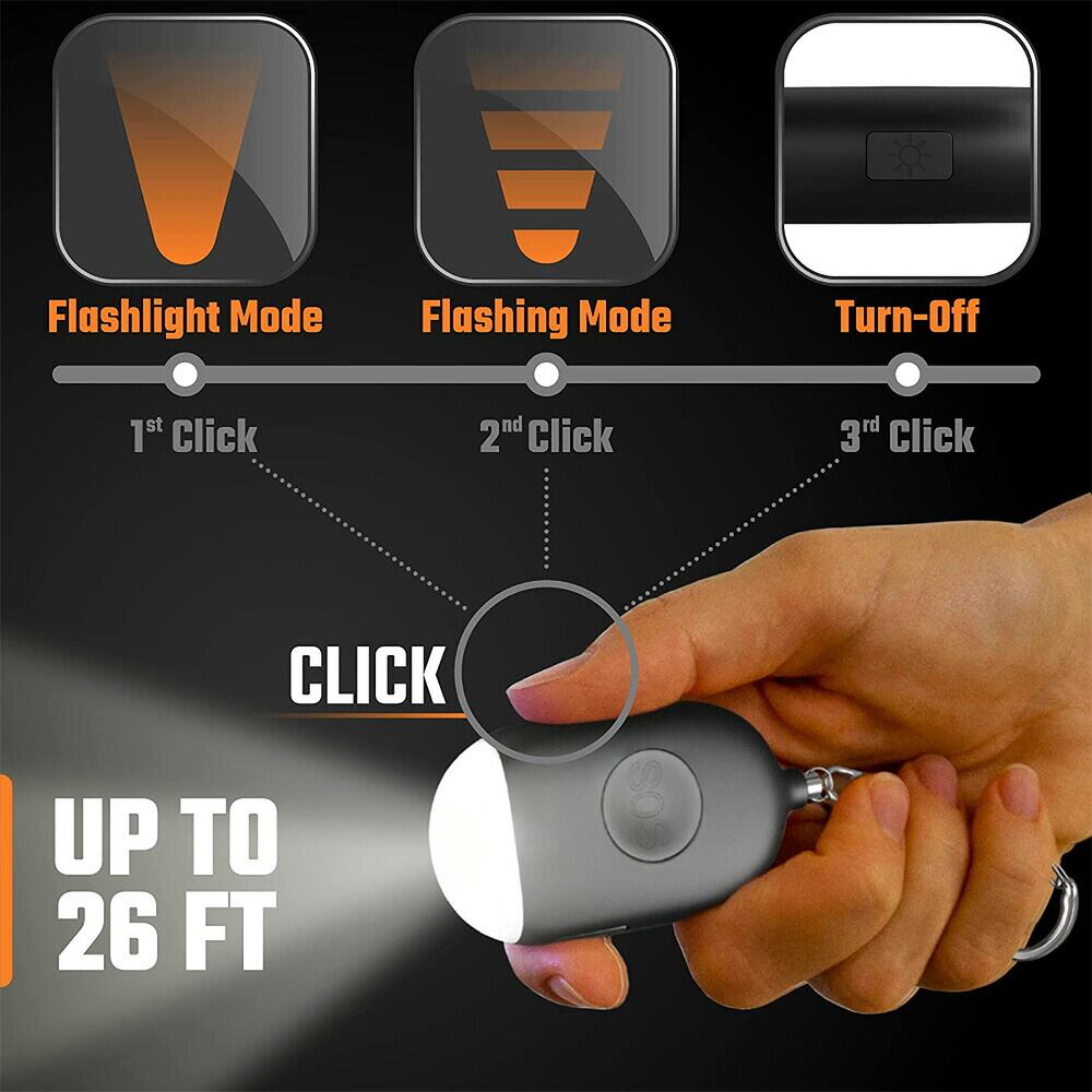 【操作が簡単】キーホルダーリングプラグの頭を引っ張るだけでアラームが鳴り、同時にLEDライトが点滅します。 プラグインを押してアラームを消します。 操作は非常に簡単で、すばやく身を守ることができます。