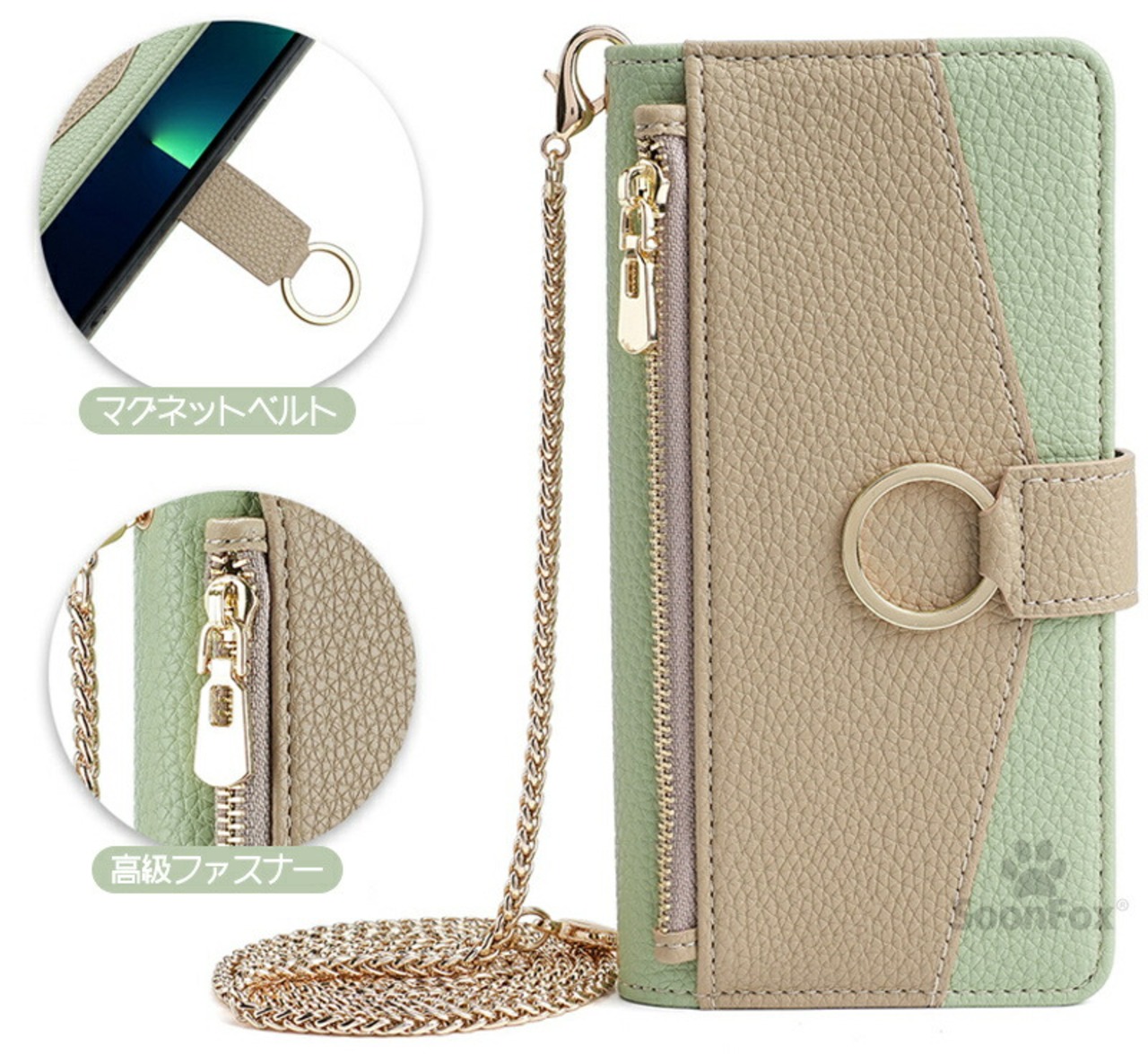 商品説明文特徴 ・取り外し可能チェーン型ショルダーストラップ付属のシボ加工のレザー製手帳型ケース。