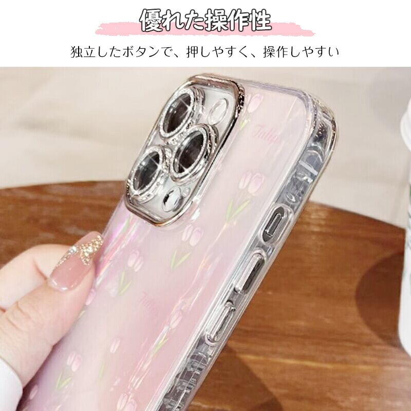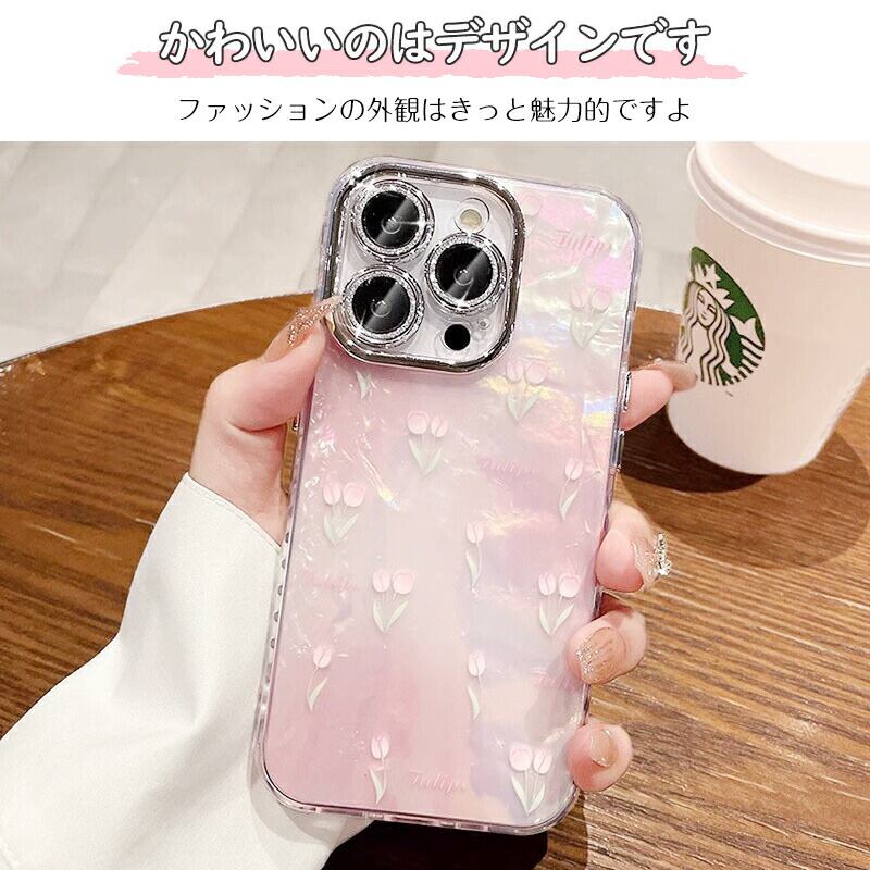 シェル風透感キレイチューリップ柄フラワースマホケース iPhone15pro ケース魅力の大人可愛いシンプiphone14 pro ケース一体型カメラレンズフィルム付iphone13 13pro 12